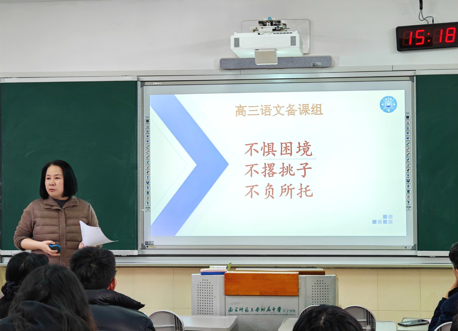 随后,高三语文备课组长薛颖颖老师、地理备课组长汪婷老师从学科教学的角度,高三(1)班肖劲松老师、高三(4)班主任夏越老师从班级管理层面,与大家分享他们行之有效的实践经验与可借鉴方案,实现智慧共享。集中研讨结束后,各班级还开展了班情学情专项分析,进一步细化分工,明确责任。