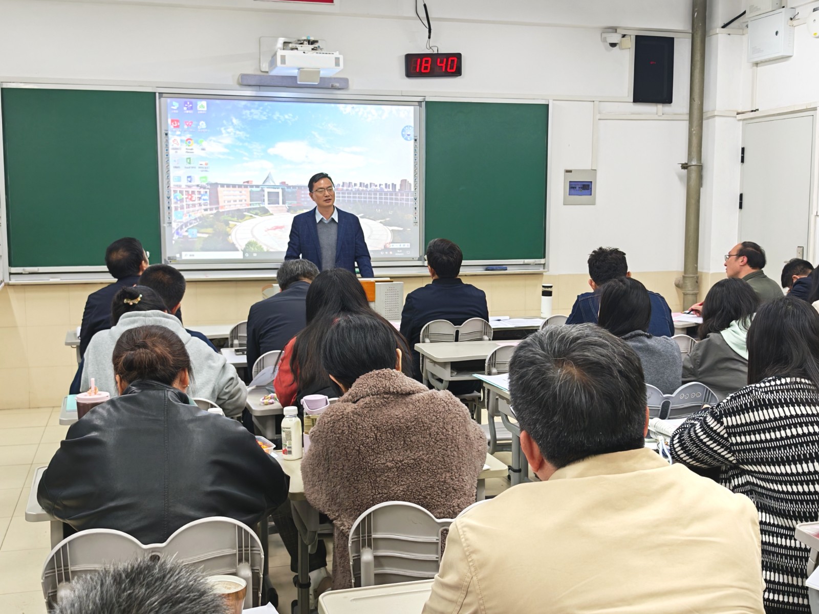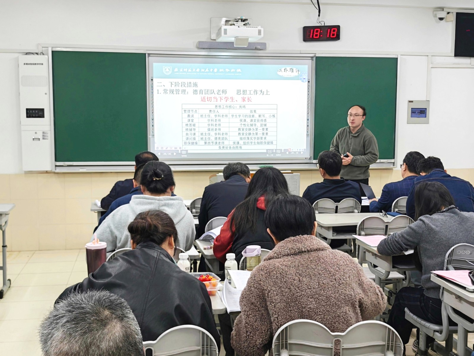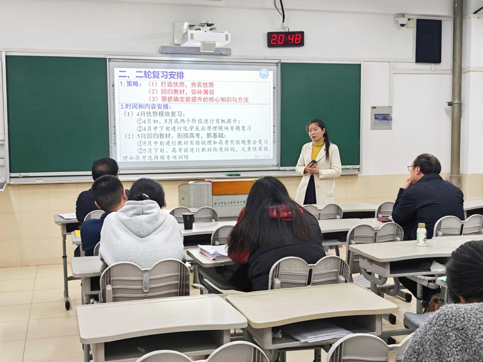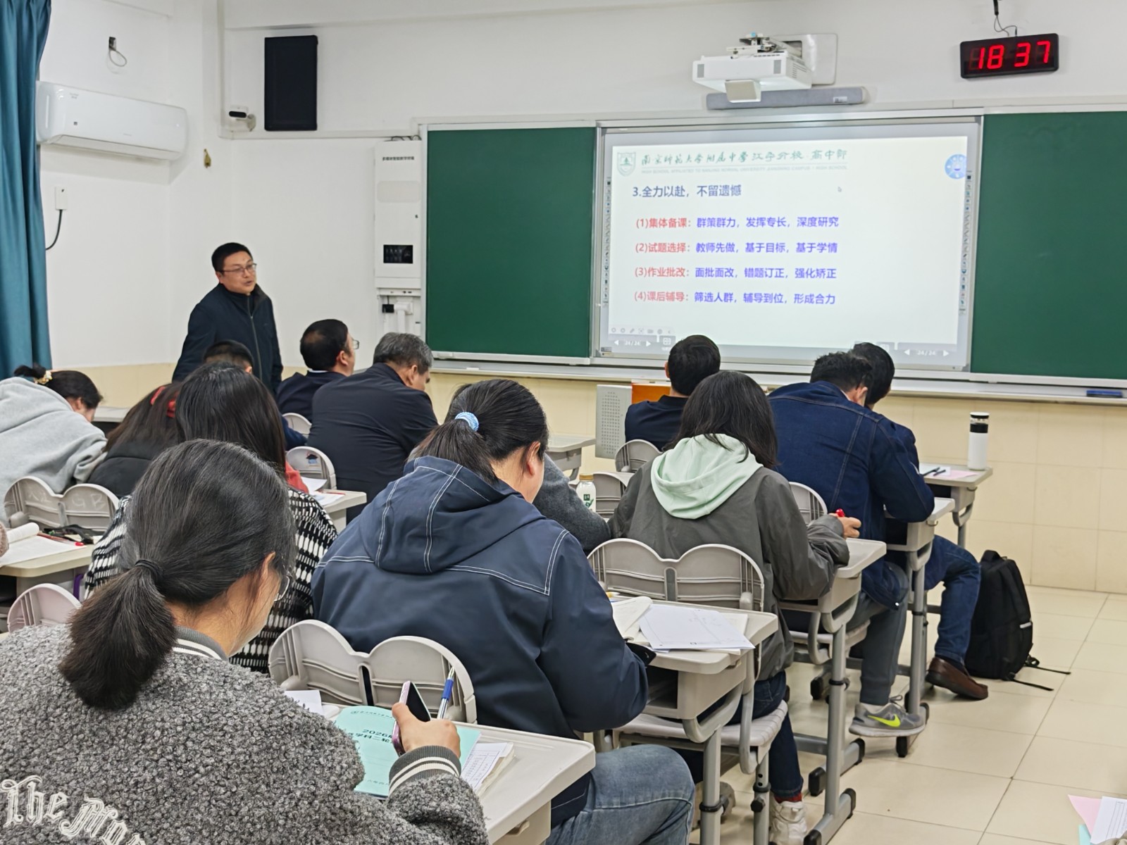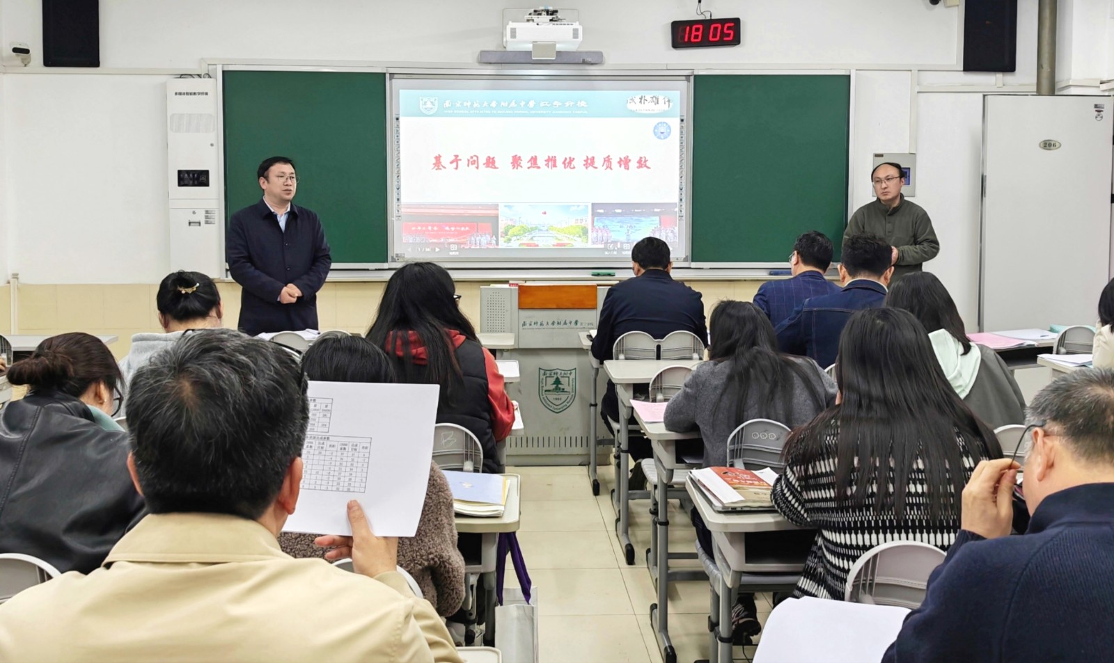 4月3日晚,高三一模考试教师分析会在A1楼206教室召开,全体高三任课教师、学科备课组长及校领导参会,会议由周天航校长主持。会上,高三年级万滨主任全面解读一模考试数据,结合全市学情对比,精准剖析年级教学成效与现存问题,明确下一阶段年级组工作要求;高中部刘斌副校长基于数据分析,从“精准诊断、找准问题”“精准施策,提质增效”“全力以赴,不留遗憾”三个方面就优生培养提出具体要求。会议还特别邀请南京市教研室龙艳文副主任参会。龙主任围绕学生分层、精准教学、考试策略等问题做了具体指导。