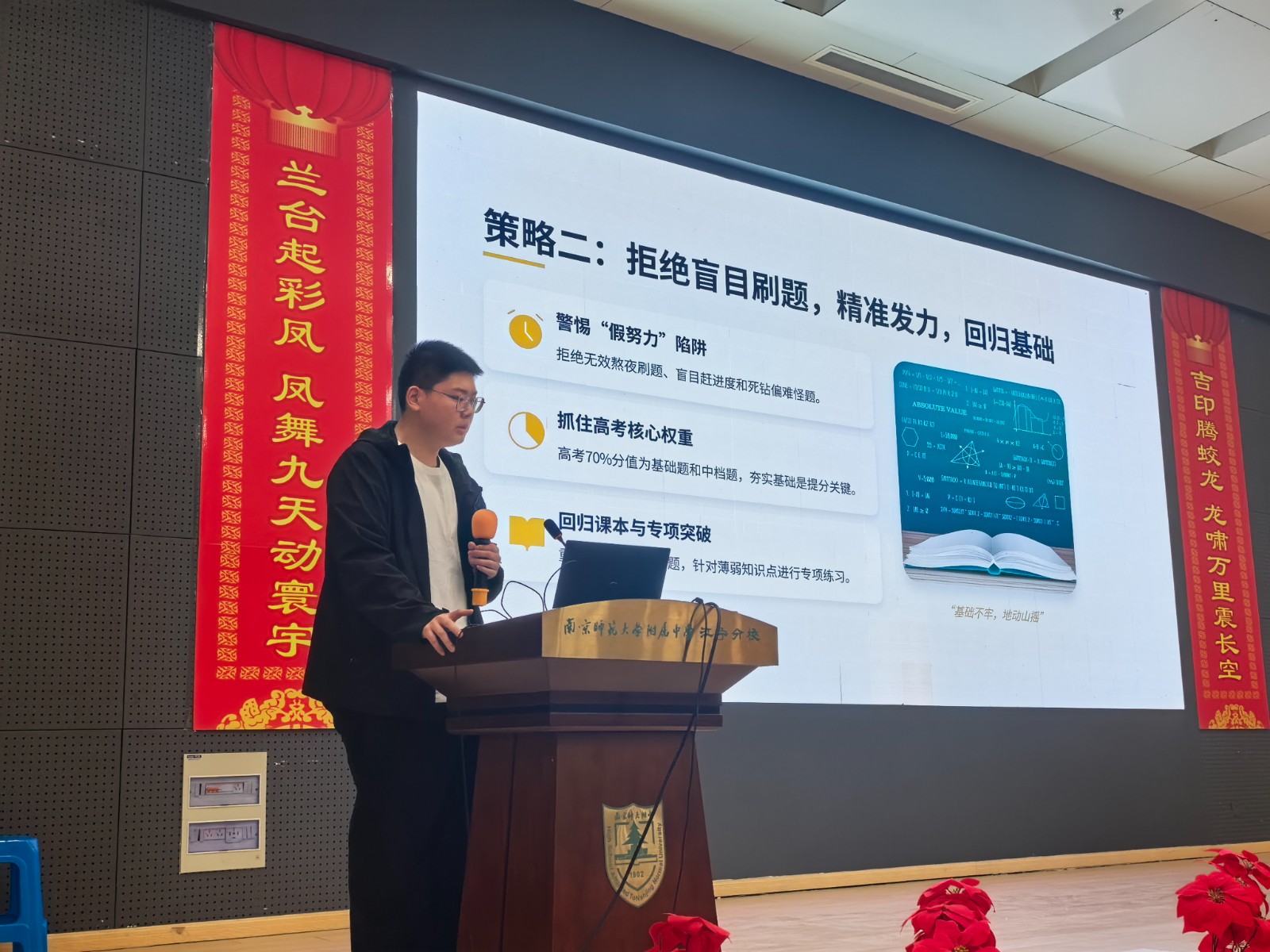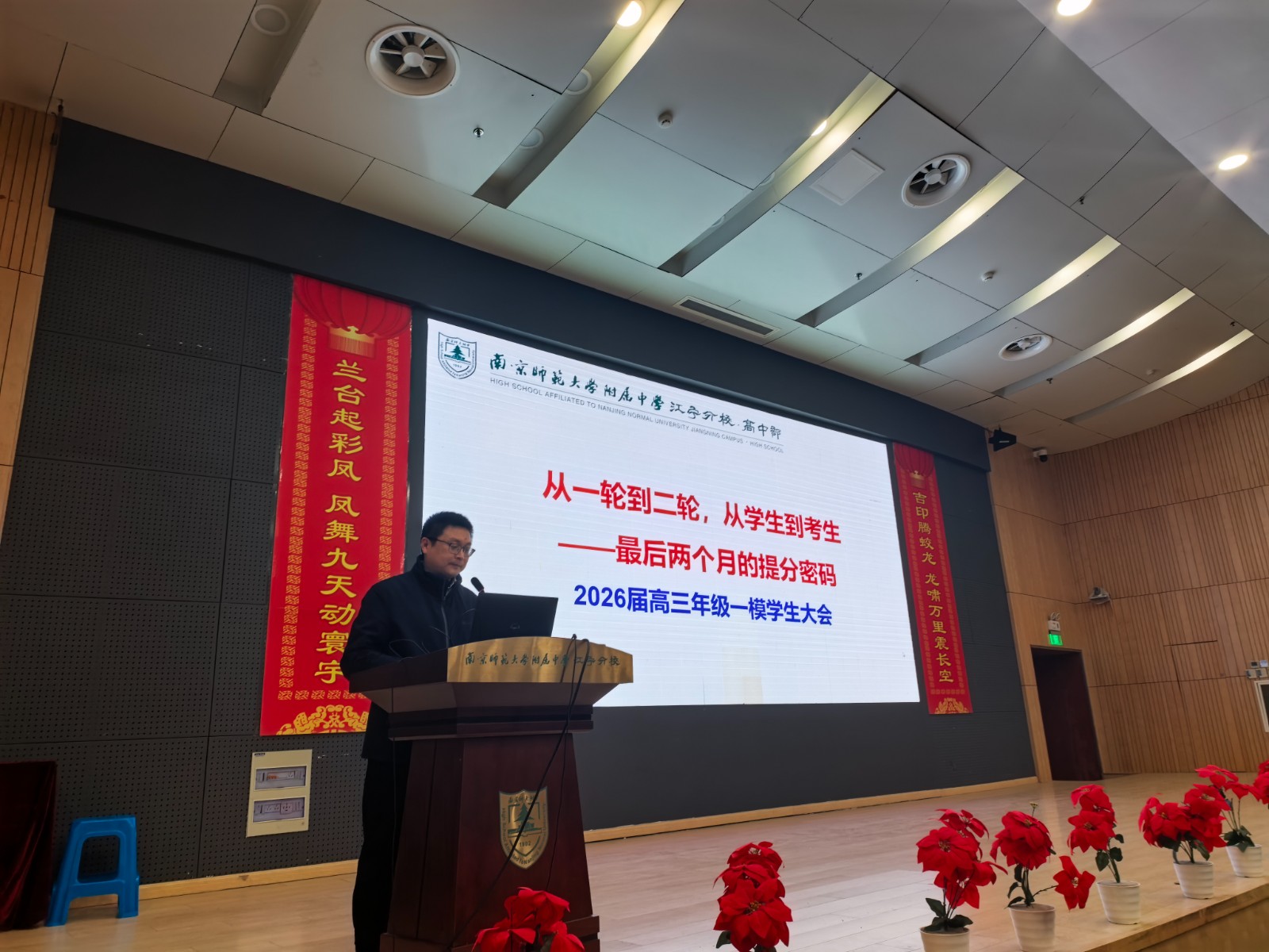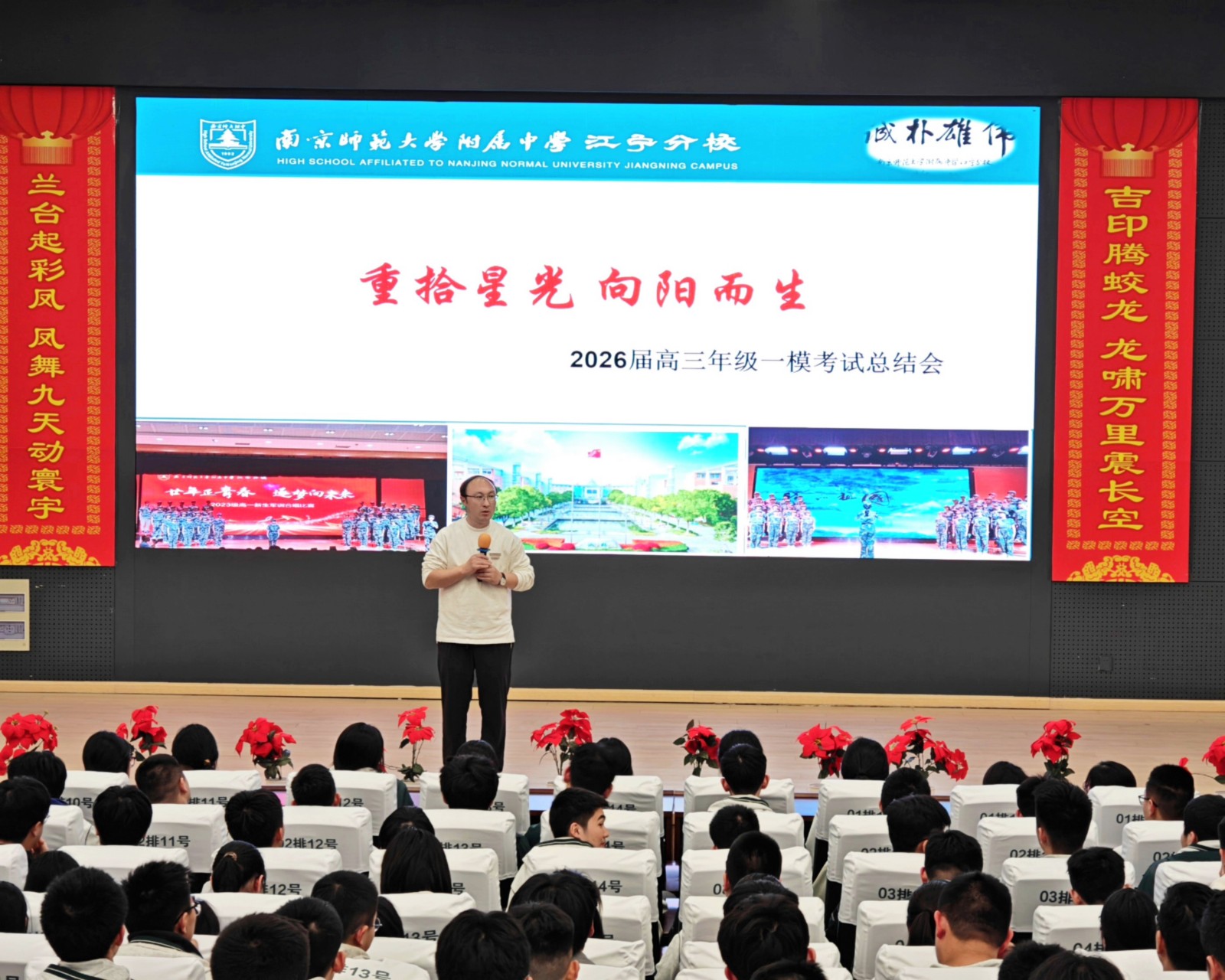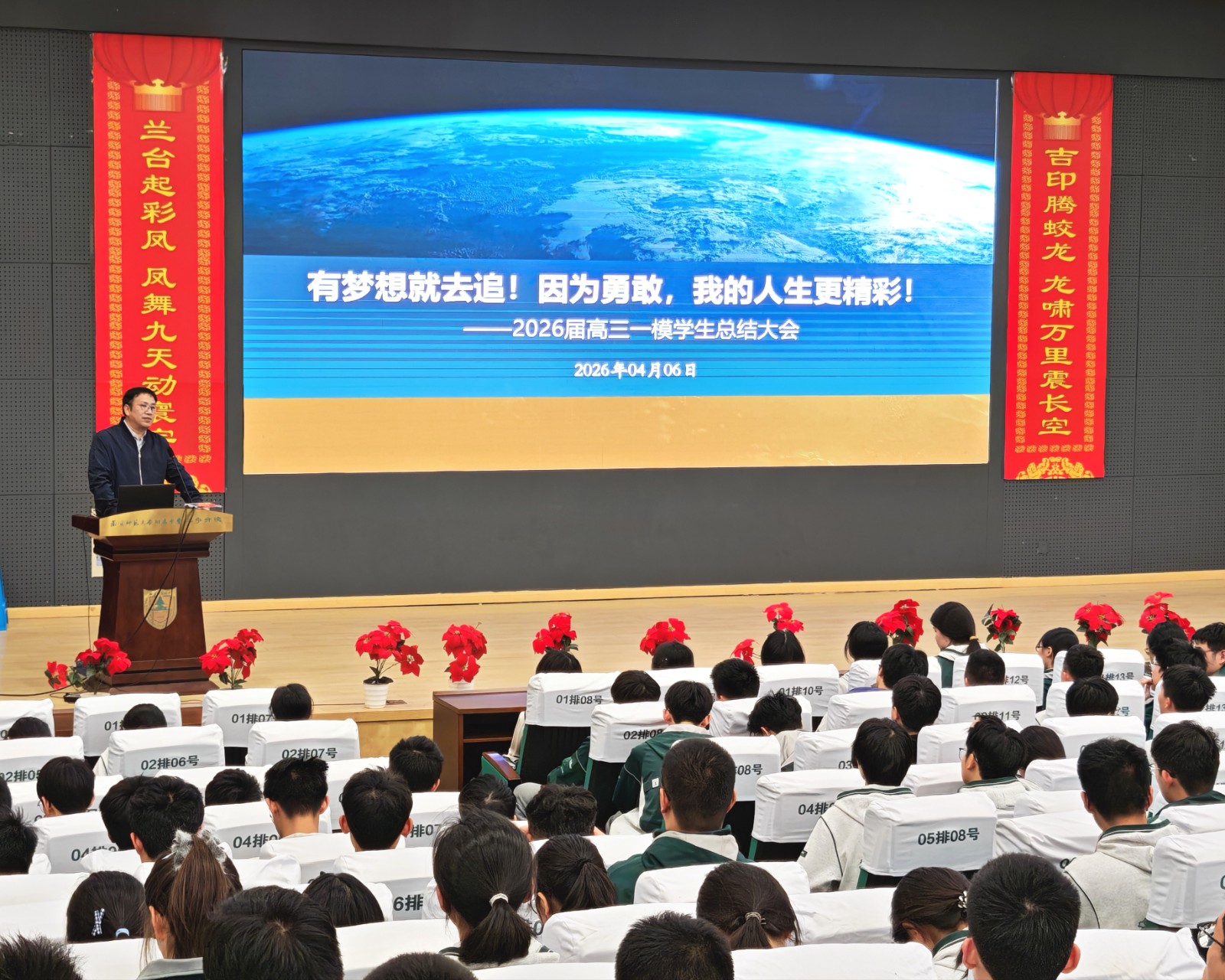 4月6日晚,高三一模考试学生总结会在学校报告厅举行,会议以“有梦想就去追!因为勇敢,我的人生更精彩”为主题,全体高三学子齐聚一堂,共话成长、共赴未来。2025届学长郭凯同学、学校纪湘元副校长、高中部周天航校长、高中部刘斌副校长依次发言,为同学们送上鼓励与期许,从心态调整、备考方法、目标规划等方面给予针对性指导,激励大家以昂扬姿态迎战高考。高三年级主任万滨作《重拾星光 向阳而生》主题发言,结合具体数据及平日的观察,带领同学们复盘一模得失,鼓励大家正视差距、重拾信心,最关键的是将所有提分举措落到实处,争取在二模中取得进步。
