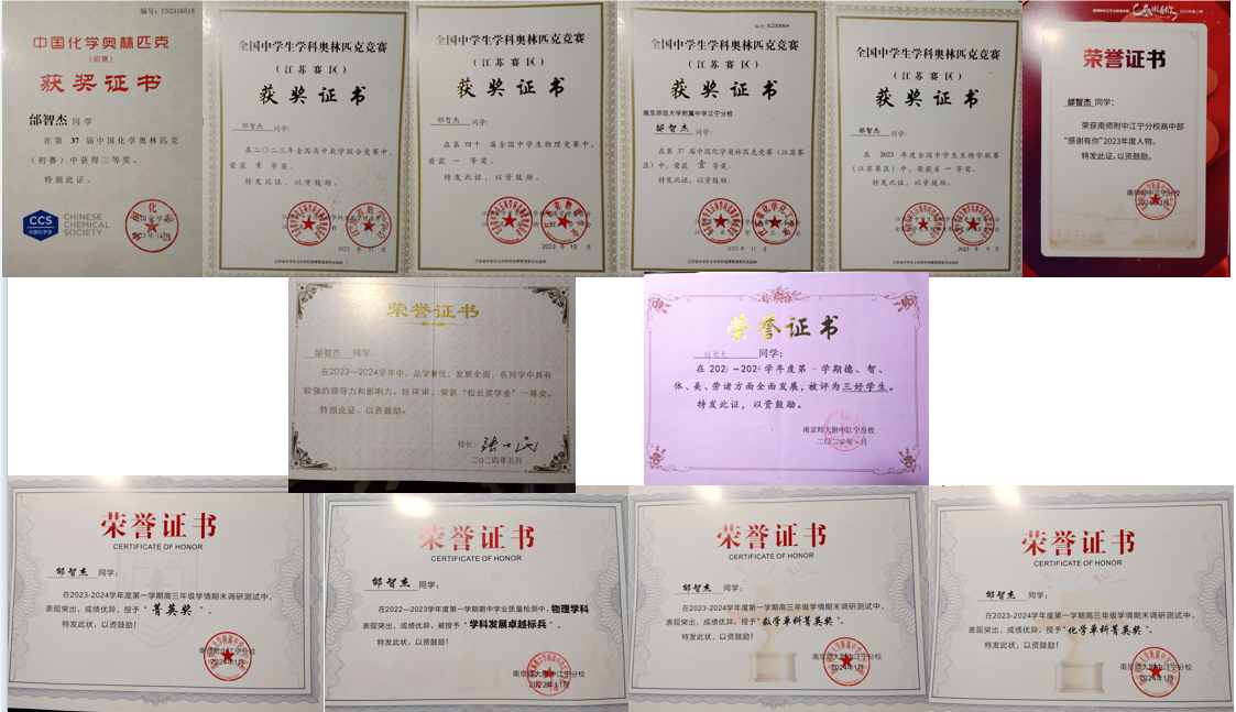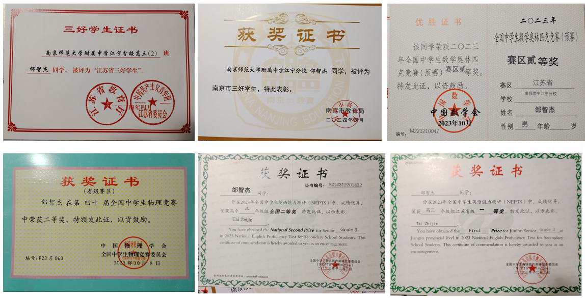 邰智杰,南师附中江宁分校2024届毕业生,现被清华大学工程物理系录取。2024届高三(2)班学习委员,校菁英班成员,初高中均就读于南师附中江宁分校。他学业优异,校内成绩名列前茅,校外在竞赛上也有所成就,数物化生四门竞赛均有获奖;他乐观活泼,乐于助人,与同学相处融洽;他兴趣广泛,参加校足球杯,参与科技节等活动。未来人生,他将向着心之所向,日复一日,不断精进。