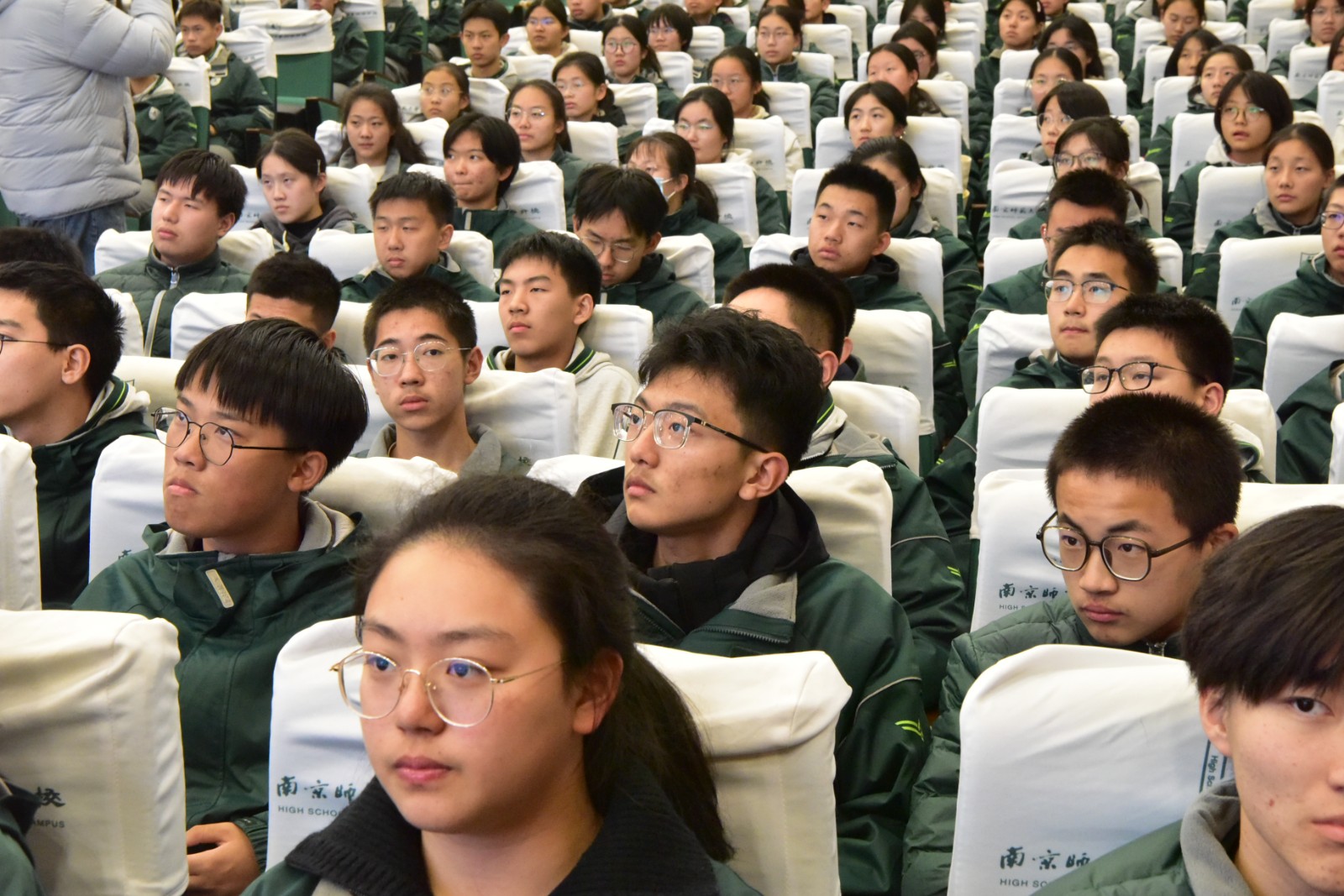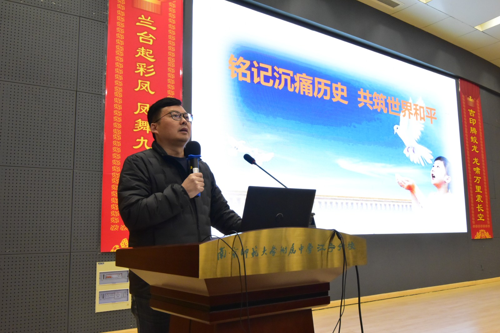 为深化爱国主义教育,引导师生铭记历史、珍爱和平,12月8日下午,南师附中江宁分校高中部在报告厅开设了《铭记沉痛历史 共筑世界和平》思政大讲堂,全体高一学生、班主任及部分青年教师到场聆听,共同接受了一场深刻的精神洗礼与思想淬炼。此次思政课由高中部资深历史教师王俊华老师主讲,由高一年级姚国成主任担任主持。
