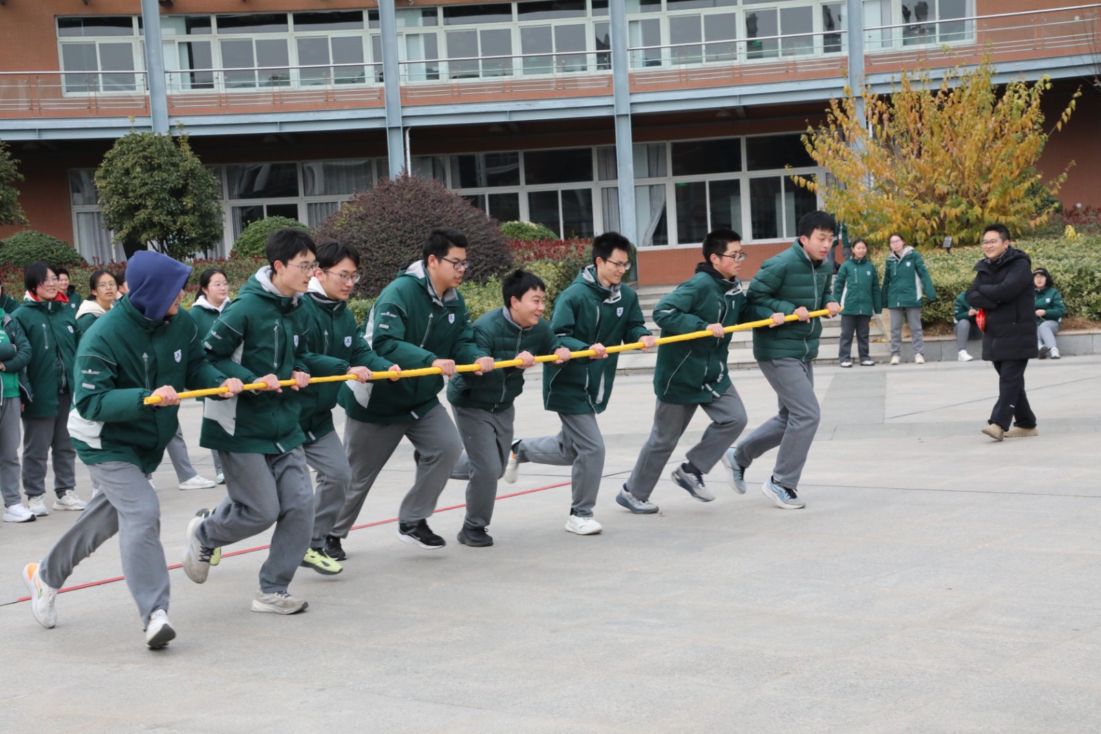 健身走结束后,趣味运动会随即登场,成为点燃师生热情的又一高潮。高中部各年级学子踊跃参与,在传统项目与趣味项目中各展所长。跳长绳赛场上,12名同学默契配合,绳子翻飞间尽显团队协作之美;跳短绳项目里,参赛学子身姿轻盈,跳绳击打地面的节奏声与现场加油声交织成欢乐的乐章;“一圈到底”的同学充分融入,大家手拉手传递圆环,笑声此起彼伏。各年级特色趣味项目更添活动魅力:高一年级的飞盘掷准,5男5女的班级队伍精准投掷,展现着青春的精准与活力;高二年级的持杆跑项目,16名同学手持长杆协同奔跑,考验着团队的同步与默契;高三年级的携手接力,学子们相互扶持、奋力冲刺,在竞技中凝聚起并肩前行的力量。赛场上,选手们全力以赴,场边师生呐喊助威,运动精神与集体荣誉感在每个人心中传递。