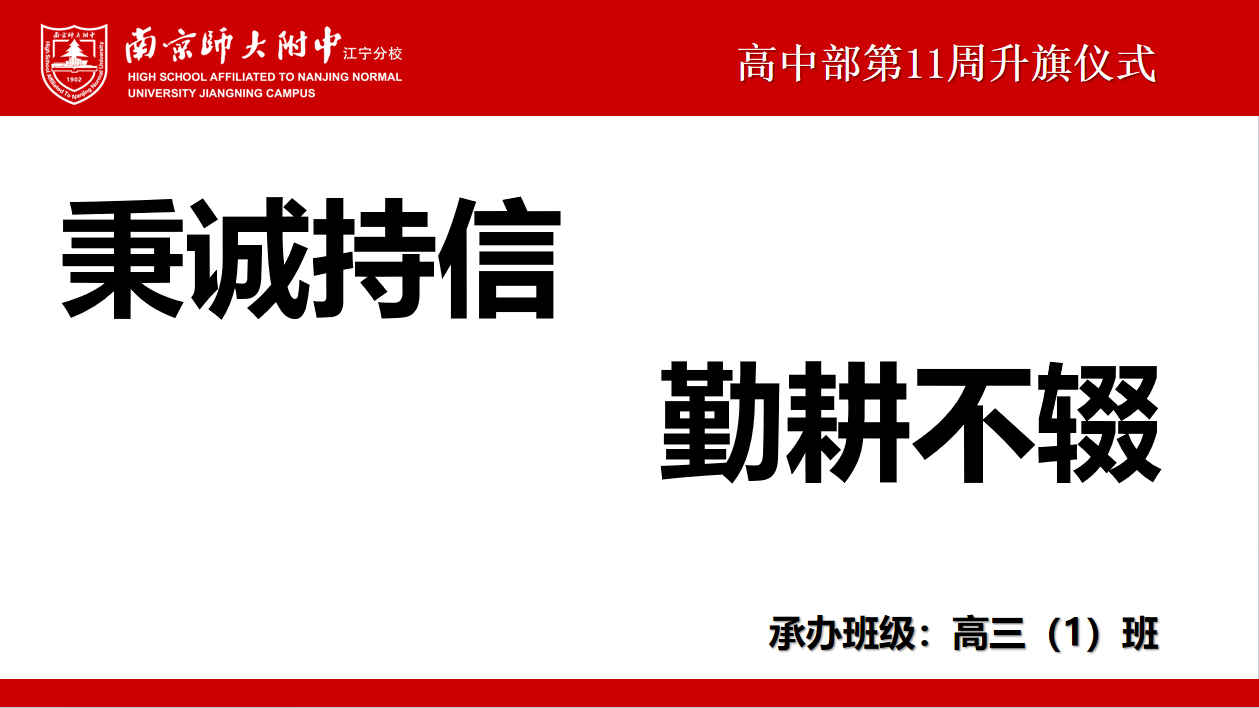 11月10日上午,南师附中江宁分校高中部全体师生齐聚圆形广场,参加以《秉诚持信 勤耕不辍》为主题的升旗仪式,本次活动由高三(1)班承办。