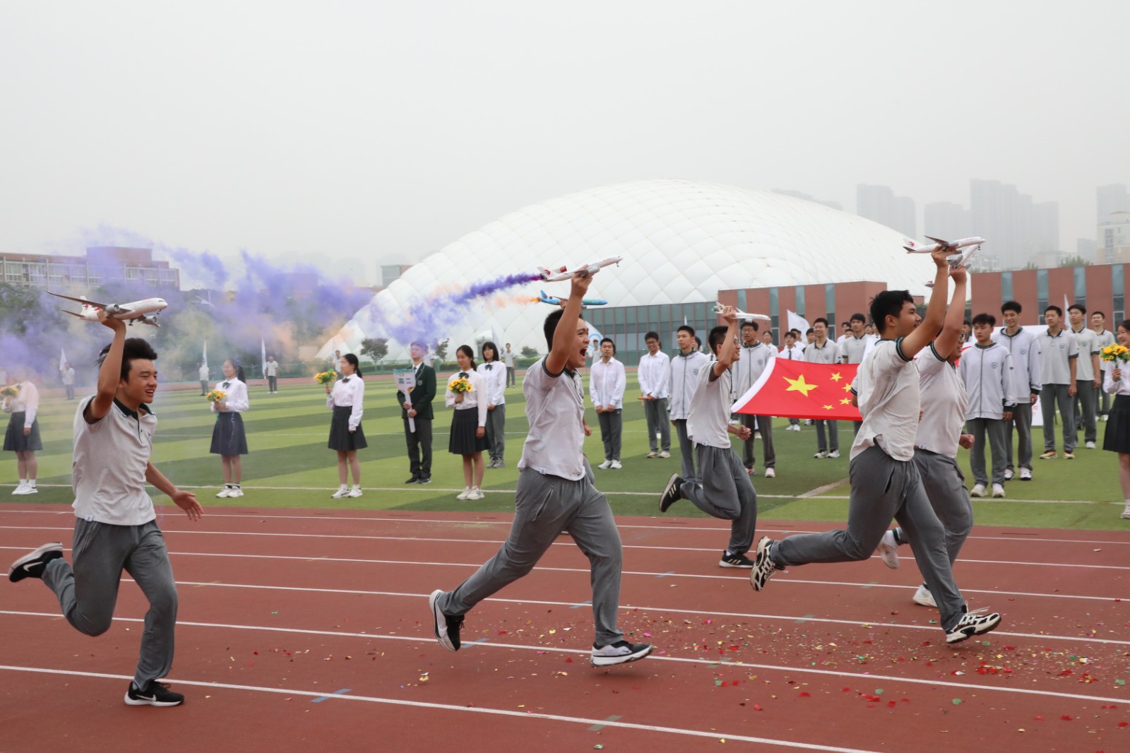 高中各年级及国际高中方阵特色鲜明。高一年级化身 “科技舰队”,以银色浪潮与字母数据展现科技力量;