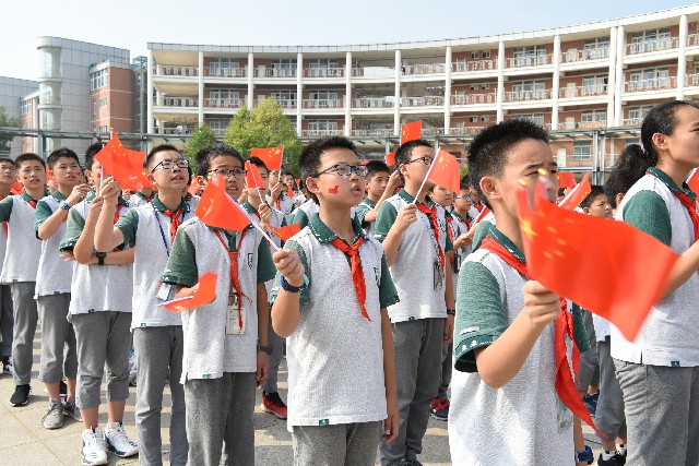 杨宁欣同学演讲后,在第十五届学生会同学的带领下,全体中小学生共同高声齐诵了《少年中国说》节选,初中部自管会主席、校长奖学金二等奖获得者初二(5)班魏良辰同学向全校同学发出《少年报国我行动》倡议书。扬子晚报有限公司总经理助理、扬子晚报少年志工作室主任王璟女士与我校党总支书记、校长张士民老师共同为我们揭晓了我校小学部献礼新中国成立70周年艺术作品。这副作品题为《我眼中的祖国》,以小学部同学们的部分优秀摄影作品组成中国地图。在这一张张的图片中,我们看到祖国的壮丽山河,也感受到同学们按下快门的那一瞬间,所流露出的对祖国真挚的爱!