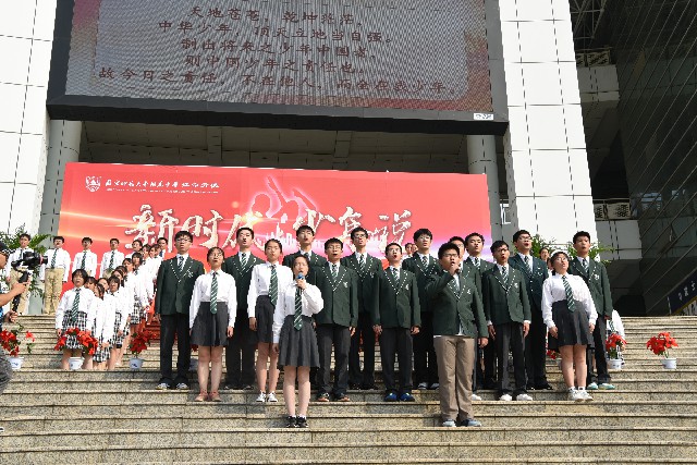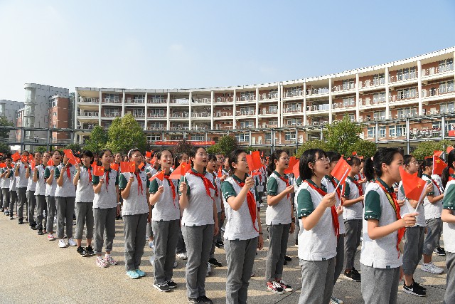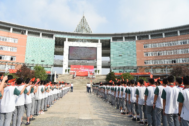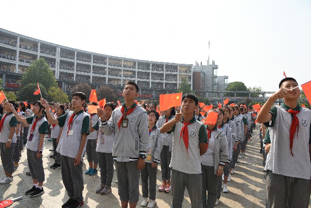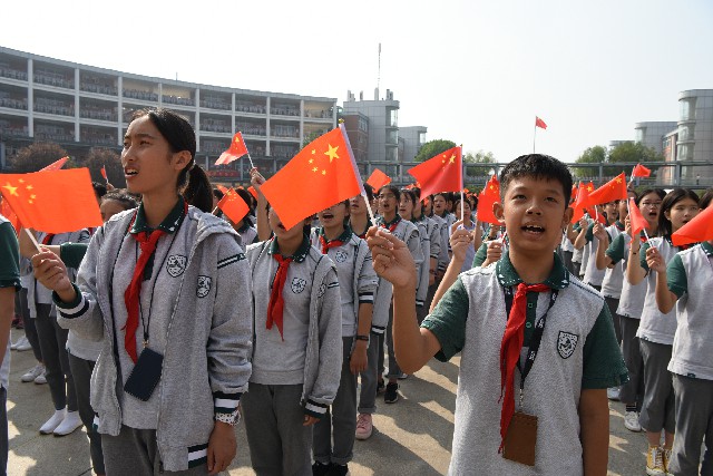 最后,全体9000多名师生,挥动手中的五星红旗,满怀激情的高声唱响《歌唱祖国》!歌声中传递出新时代少年们对祖国的赞美,以及作为中华人民共和国公民的骄傲与自豪!
