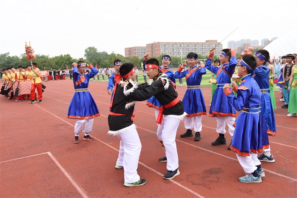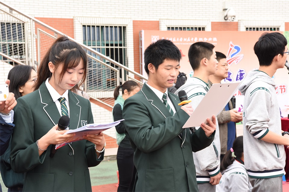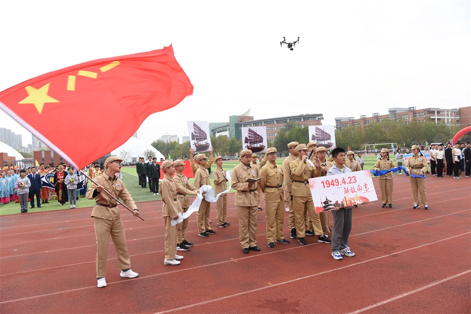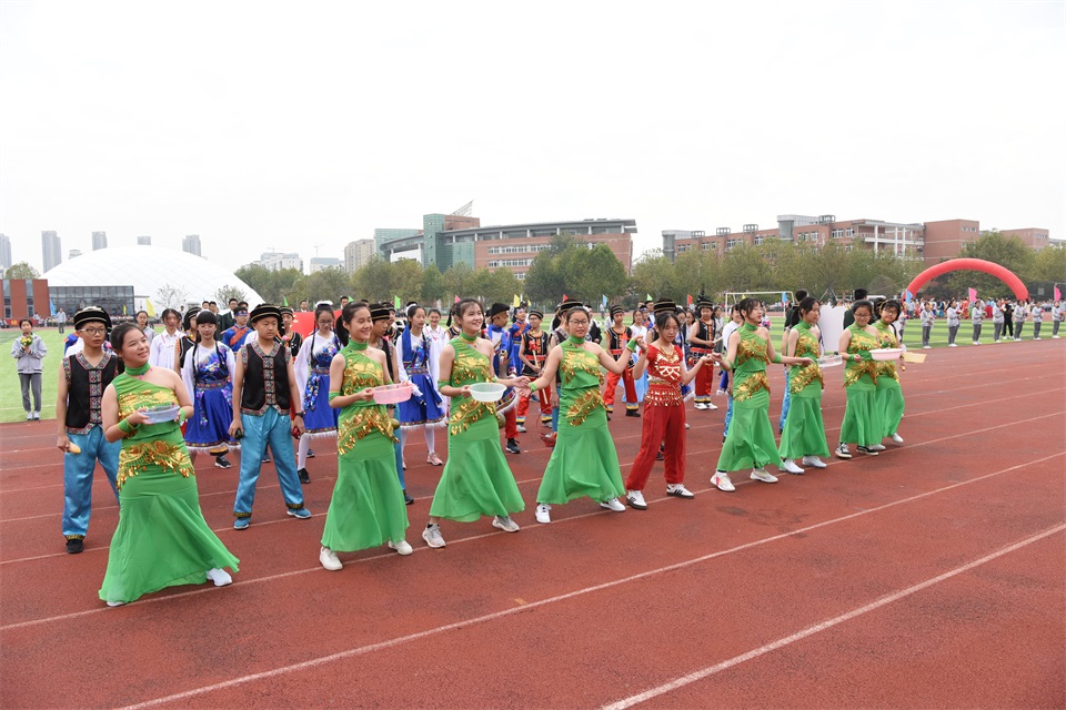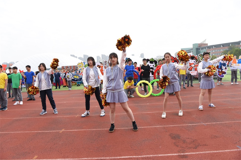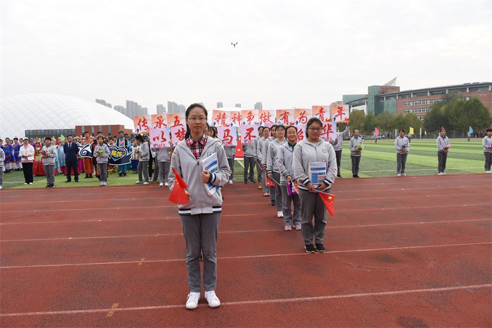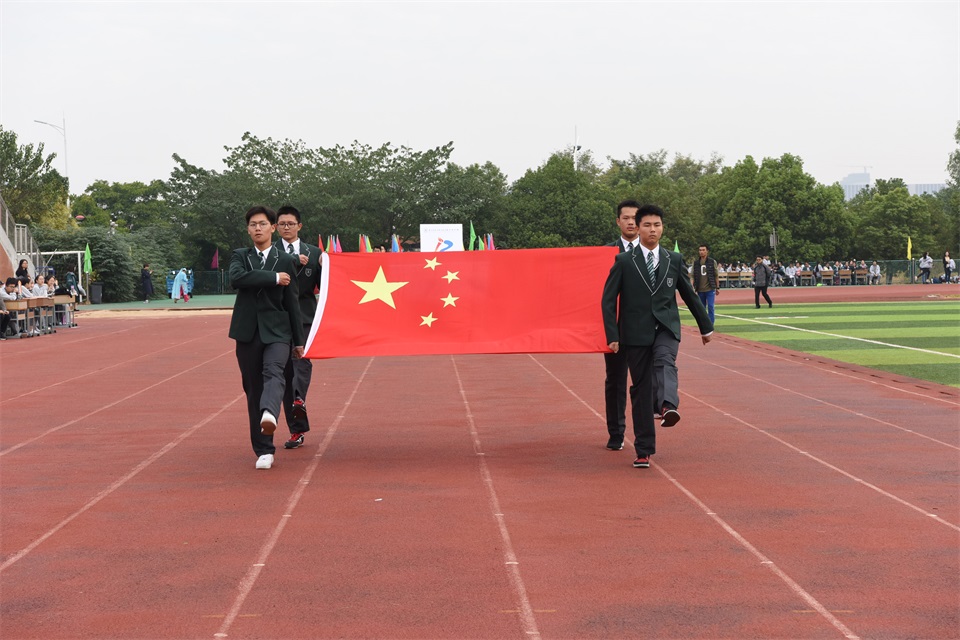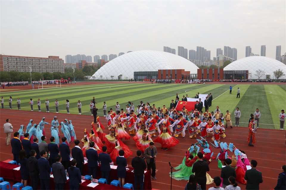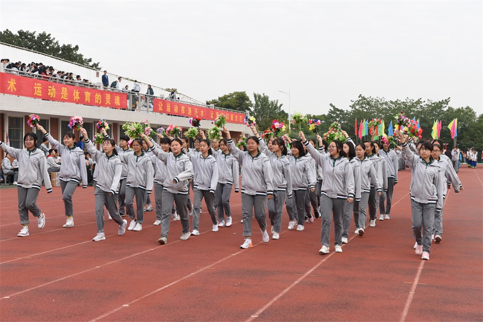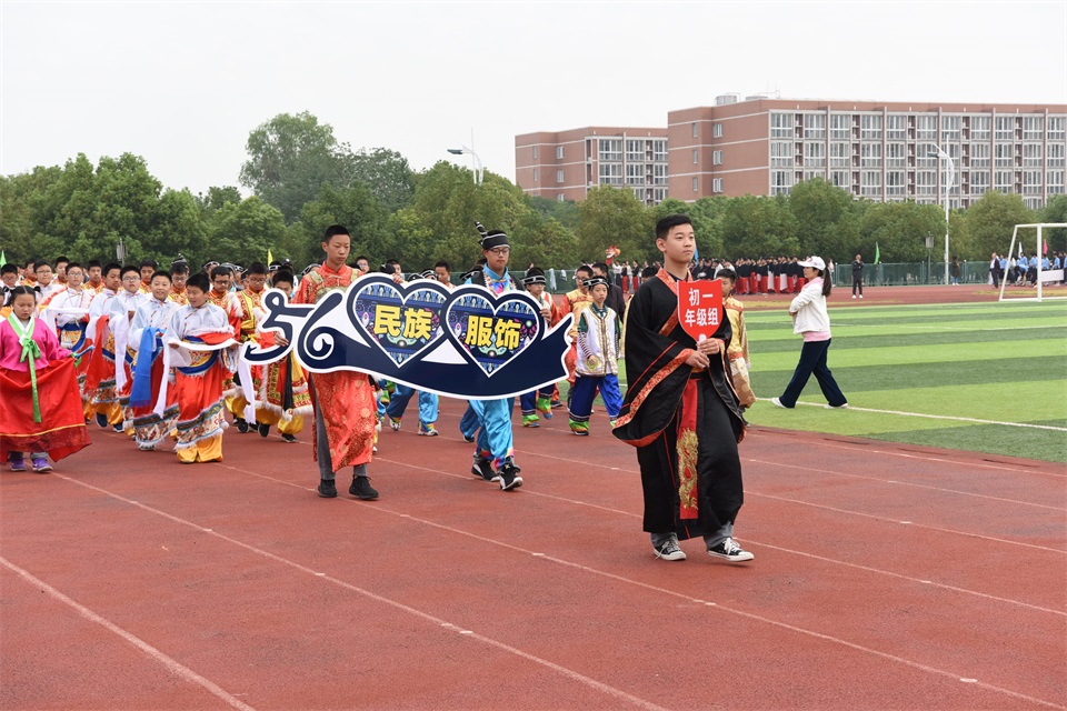本届运动会开幕式以庆祝中华人民共和国成立70周年为主题的入场展示,充分展示了各学部、年级、班级、社团的精神风貌和青春活力。伴随着激昂的运动员进行曲,国旗、校旗、会徽、鲜花、彩旗和特色班级、特色社团方阵依次入场。学校精心组织安排,各年级、各社团认真准备,入场式精彩纷呈。初一年级方阵的同学们身穿各民族服饰,展示我国丰富多彩的民族文化,初二年级方阵的同学们展示了具有浓郁民族特色的传统节日,初三年级方阵的同学们展示了各民族体育文化的丰富多彩。高中部的入场表演给观众带来了不一样的感动:高一年级方阵的同学们回顾了从五四运动到新中国成立的光辉历程,高二年级方阵的同学们展示了新中国成立以来的重大历史事件与辉煌成就,高三年级方阵的同学们展望了未来三十年祖国的宏伟蓝图,激励广大学子学好文化知识,报效祖国,实现中华民族的伟大复兴。国际部高一年级方阵的同学们展示了丰富多彩的奥运会比赛项目,鼓励大家拼搏奋斗,为国争光,国际部高二年级方阵的同学们带来了自主编排的中华武术操表演。同学们的精彩展示,充分展现了分校学子的精神风貌,赢得广大师生和在场观众的阵阵掌声。