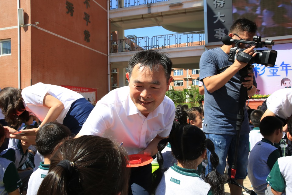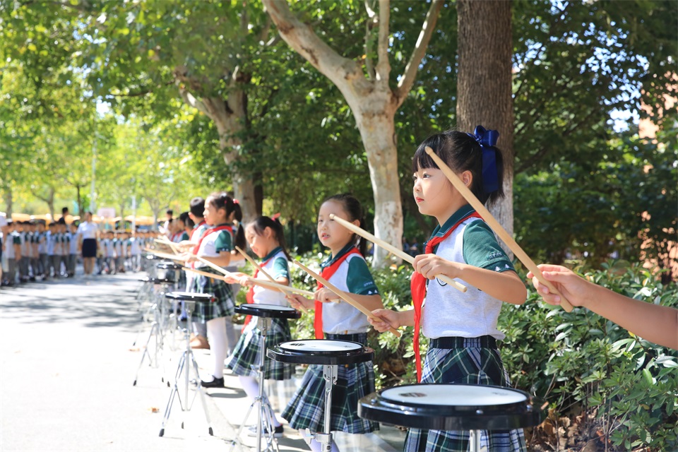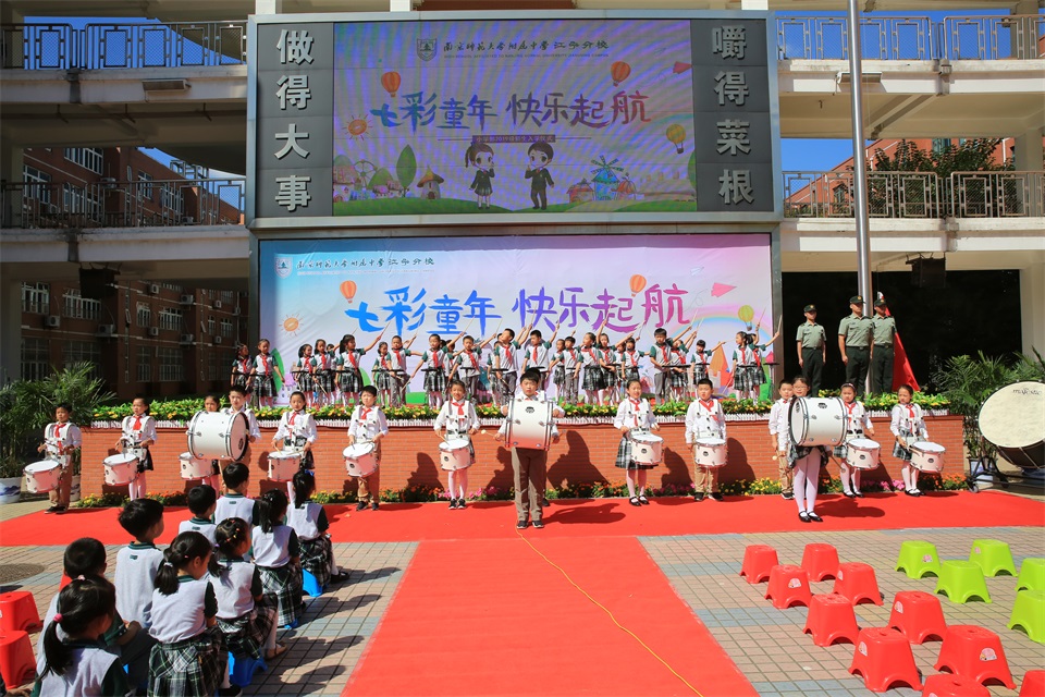 上午10时,学校鼓号队分列在环形道两旁,敲着欢快的鼓点,欢迎一年级新生入场,活动在《我们都是追梦人》哑鼓演奏中拉开序幕。