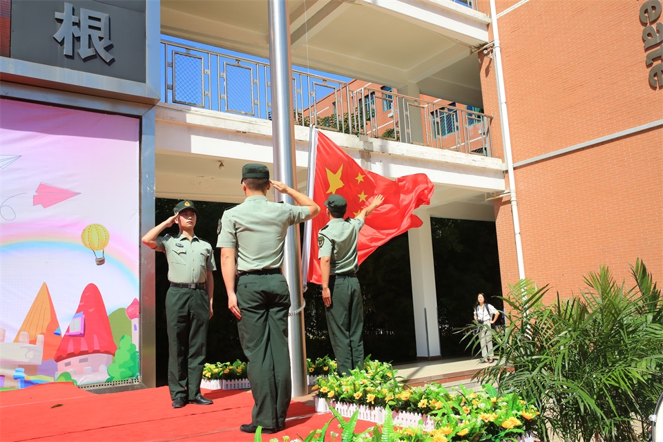 本次活动共分为三个篇章:祝福篇、明理篇、成长篇。恰逢中华人民共和国成立70周年,学校特意邀请了中国人民解放军国防科技大学国旗护卫队的官兵担任升旗手,管乐团的同学也带来了《红旗颂》演奏。官兵们铿锵有力的动作,整齐划一的步伐,让同学们回忆起开学第一周的军训,纷纷挺直了腰板,也展现出了小军人风采。