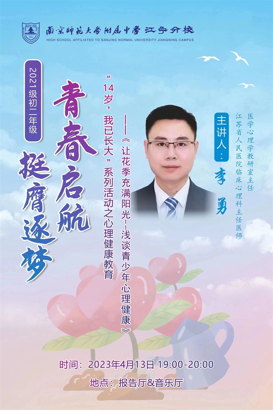 4月13日晚上19:00,我校邀请了江苏省人民医院临床心理科主任医师、医学心理学研究室主任李勇博士为初二年级学生开设青少年心理健康教育专题讲座——让花季充满阳光。