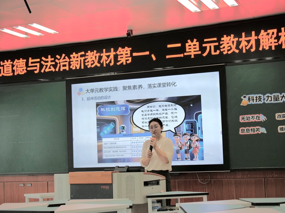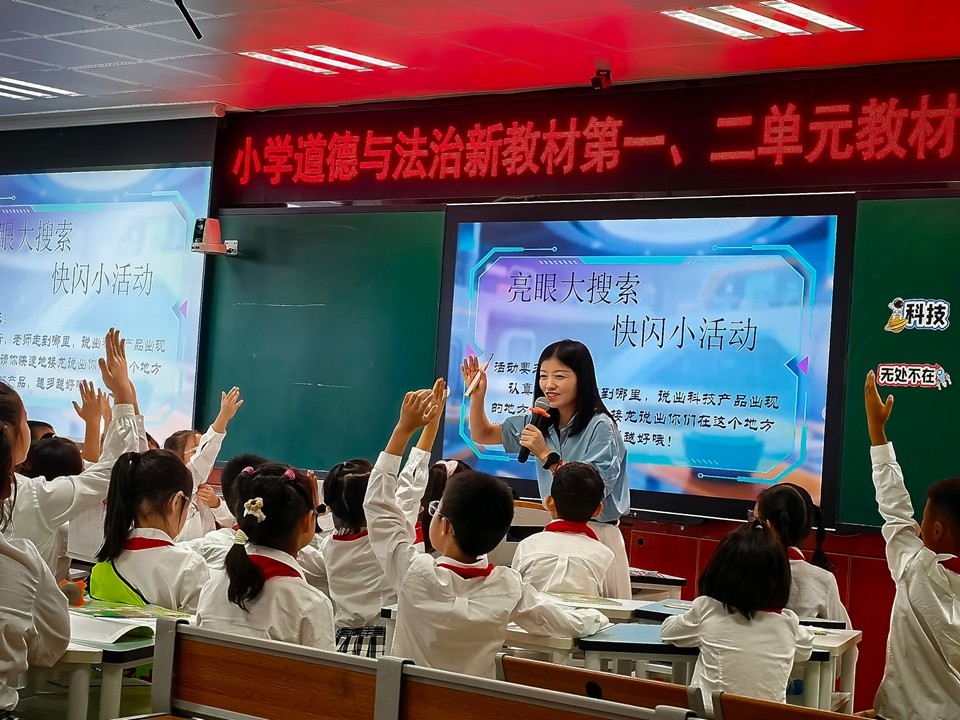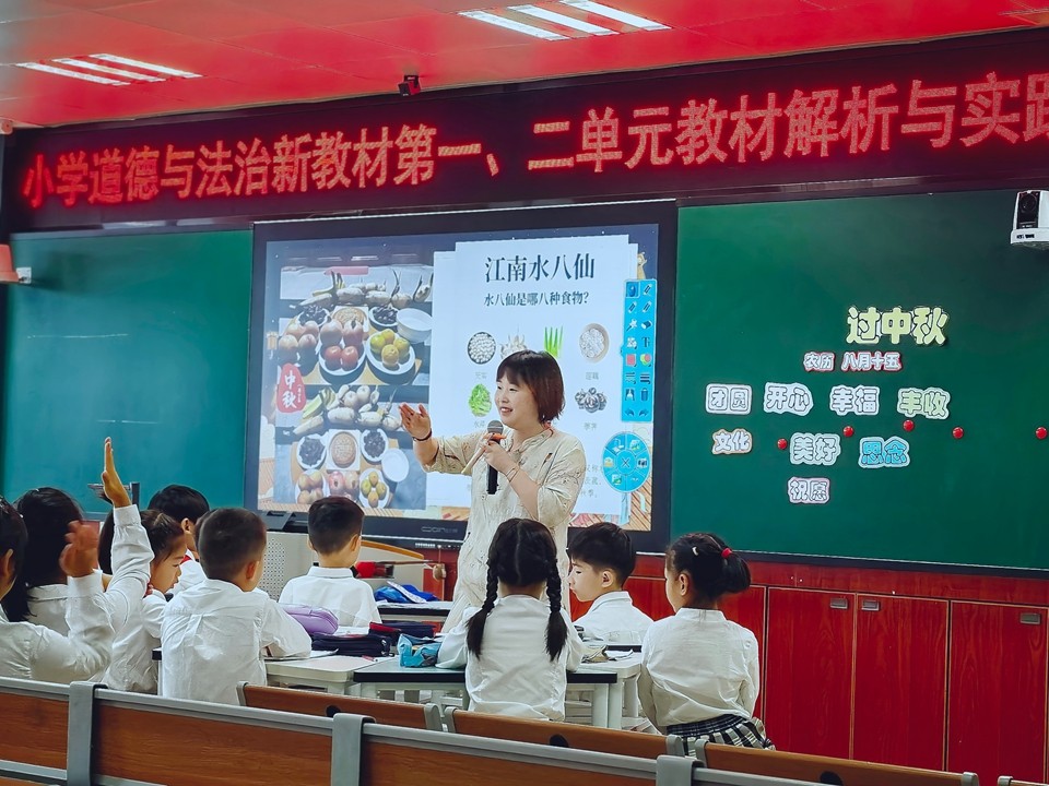 课例展示环节,南京晓庄学院实验小学胡珀老师与该校二(14)班学生,共同呈现了二年级上册第 3 课《团团圆圆过中秋》第一课时的教学。课堂上,胡老师以中秋文化为切入点,将团圆符号与家国情怀教育相融合,通过趣味互动、情境体验等方式,让学生在感受传统节日魅力的同时,深化对道德与法治课程内涵的理解,展现了新教材在传统文化浸润中的生动应用。随后,南京东南实验学校庄俊老师携手三(14)班学生,带来三年级上册第 4 课《科技力量大》第一课时教学。庄老师紧扣 “学科学,爱科学” 主题,结合生活实例与科技案例,利用AI大情境,引导学生直观感受科技对生活的改变、对社会进步的推动,为在场教师提供了科技与德育融合教学的鲜活范例。