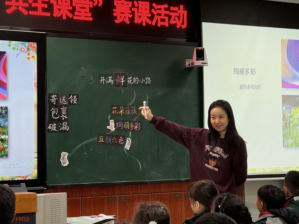 第六节课,丁培老师执教《开满鲜花的小路》,结合低段学生的特点,引导学生用各种不同的方法识字写字。在教学“鲜”字时,从字形入手,过渡到课文中花开得鲜艳,从而了解“鲜”字不同的意思。以讲故事的形式,带领同学进入本文,循循善诱,感受与别人分享快乐的意义。