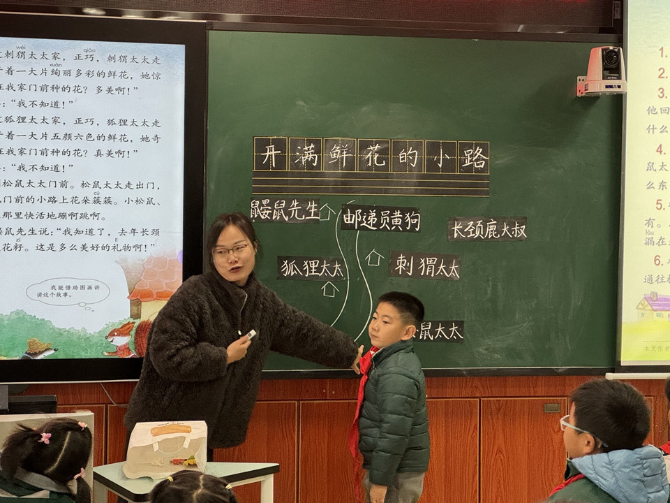 第三节课,吴春梅老师执教《开满鲜花的小路》,以体味鼹鼠先生心情变化为主线,将品读关键词句、分角色朗读等学习活动有机整合,以读促悟、以读促情,引导学生在读中理解课文内容,在读中体验角色内心,从而读好角色语气,感受“礼物”的神奇与美好。