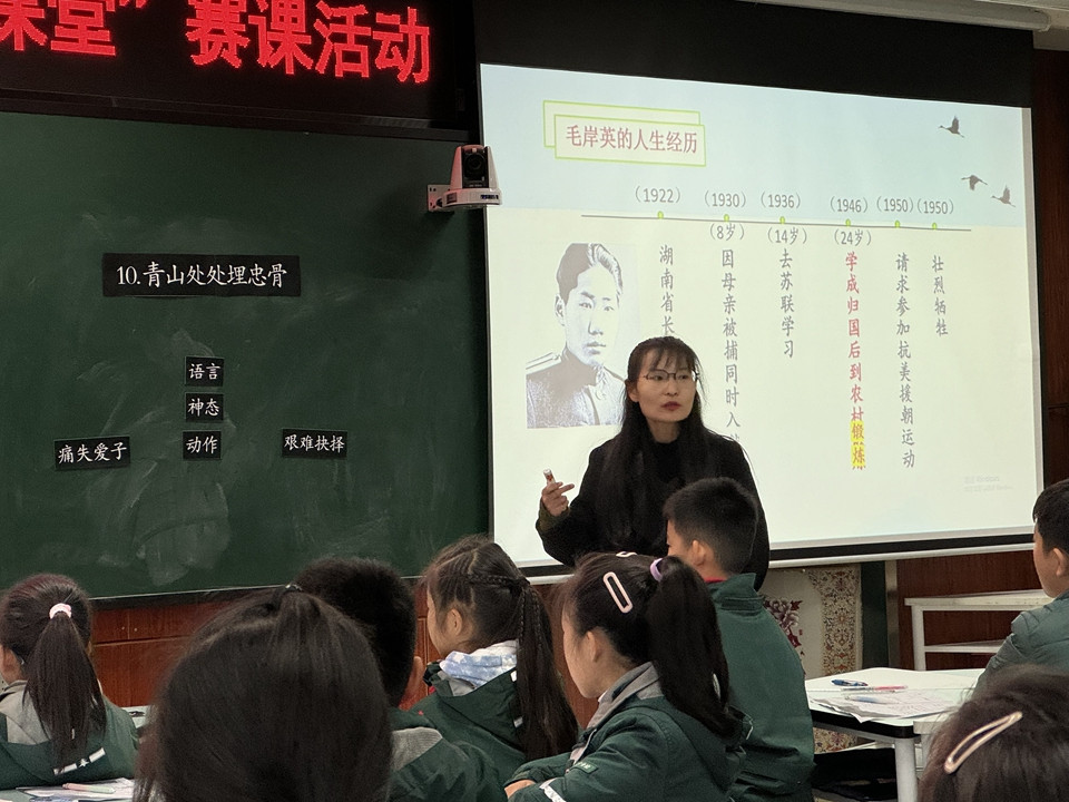 第五节课,徐晓妍老师执教《青山处处埋忠骨》。整节课中徐老师以感悟毛主席的内心世界为主线,通过反复品读、诵读描写毛主席的动作、语言、神态等语句,感悟毛主席失去心爱长子的悲痛自责心情。