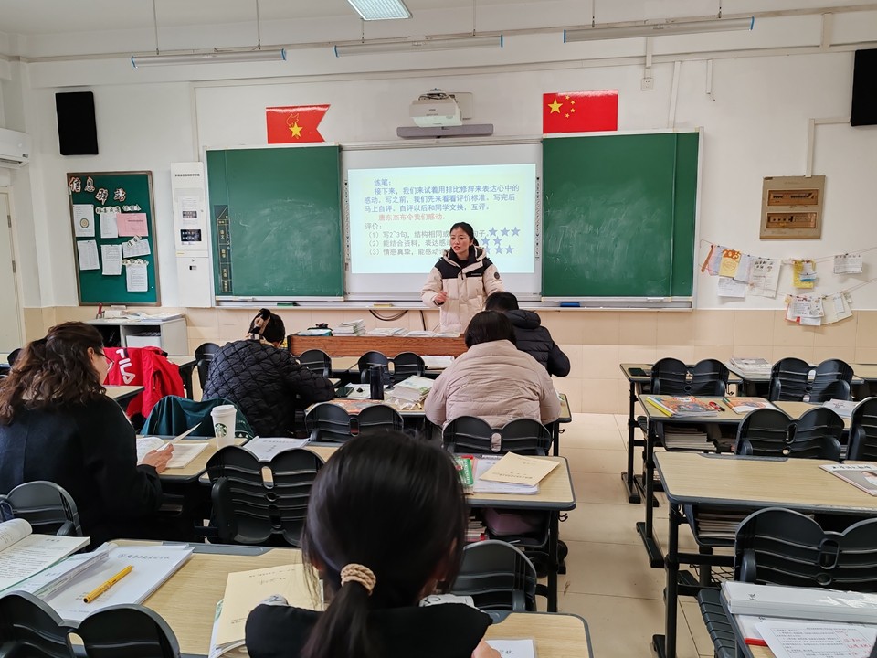 随后,刚完成组内授课的梅诗君老师以“感受藏戏魅力,传承民族文化”为主题,分享了自己的教学设计。梅老师紧扣藏戏特点,引导学生抓住令人感动的词句,深入探索藏戏的起源。在课堂上,学生通过朗读,切实感受藏戏特点的具体呈现。紧接着,梅老师引导学生学习课文中作者频繁使用的排比修辞手法,通过朗读体会其在增强语言气势、丰富情感表达方面的妙处。最后,梅老师启发学生思考传统文化在新时代背景下的传承与创新路径,激发学生对民族文化热爱的情感。