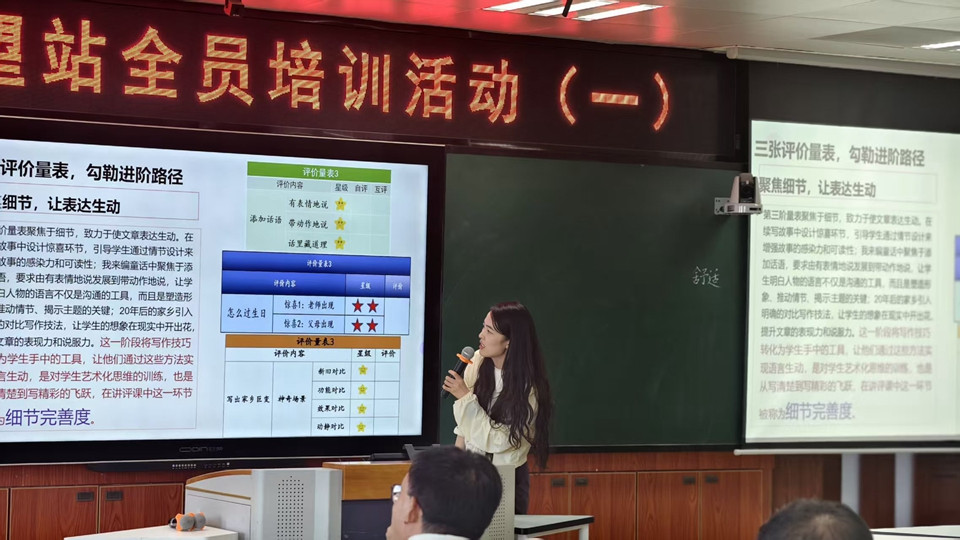 十月初,青年教师代表杨洋赴江宁区参加语文教研活动。活动中,杨洋老师沉浸式观摩四节高质量示范课,每节课都紧扣教学新理念,展现出扎实的教学功底与鲜明的素养导向。课后,通过专题研讨,教师代表系统学习四大核心理念:以读为本赋能核心素养、深化文本解读夯实单元教学、以 “读” 为支点推动教学实施、持续性评价实现 “教学评” 一致。归来后,教师在组内开展专题分享会,结合 PPT 展示与教学片段模拟,细致解读理念内涵,组内教师积极交流研讨,为后续实践筑牢理论根基。