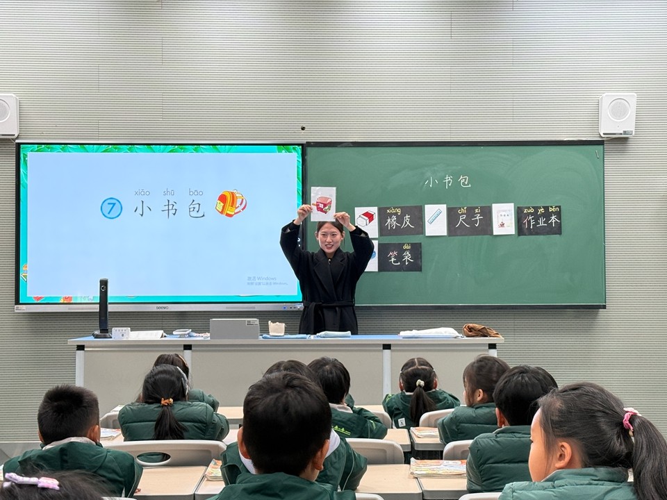 陈婷婷老师在《小书包》一课中,巧妙结合儿歌与生活情境,引导学生从熟悉的学习用品入手认识汉字。她通过《小书包》儿歌导入,结合“橡皮”“尺子”“铅笔”等日常学习用品词汇,帮助学生认读词语,还利用小游戏巩固词语认读,让抽象的识字内容变得生动可感。课堂上,学生在自读、指名读、齐读的互动中,逐步掌握生字与词语,在轻松有序的氛围中完成了复习与新知学习。