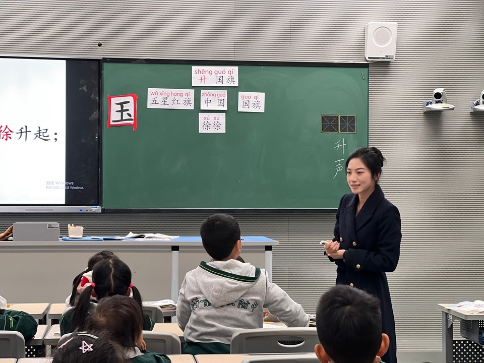 黄怡老师带来《升国旗》一课。她以视频导入的方式,引导学生在情境中学习《升国旗》相关内容,注重识字与情感体验的结合。黄怡老师先通过“升”的组词、“国”的识记方法等环节落实识字目标,又结合“认识五星红旗”“用三个词语连句”“理解‘五星红旗’含义”等环节深化内容理解,还设计了“读句子”“体会‘徐徐升起’‘迎风飘扬’”“明确升国旗礼仪(向着、望着、立正、敬礼)”等环节,让孩子们在层层递进的学习中,既掌握了知识,又浸润了爱国情感,课堂气氛庄重而专注。