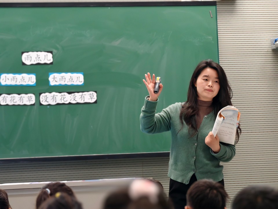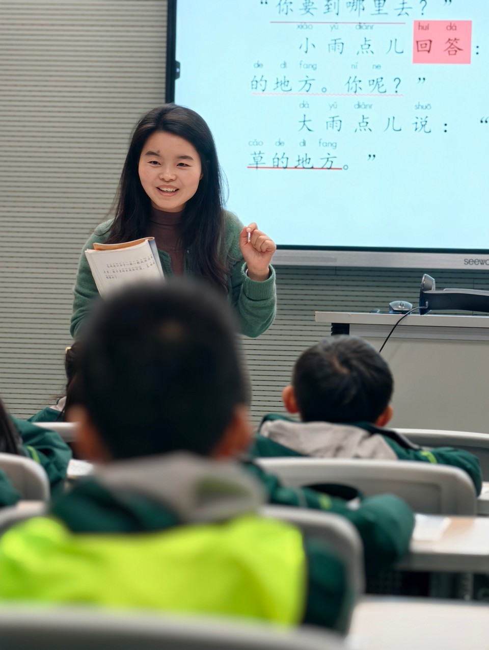 曹亚琴老师在课堂伊始,用一则充满童趣的谜语 “千条线,万条线,落入水中就不见” 瞬间抓住了学生的注意力。孩子们争先恐后地举手,迫不及待地分享自己的答案 ——“雨”。趁着这份热情,曹老师顺势出示 “雨点儿”,引导学生观察字形变化,重点指导儿化音的朗读技巧。在反复认读中,学生不仅掌握了儿化音的读法,更体会到了汉字的奇妙韵味。