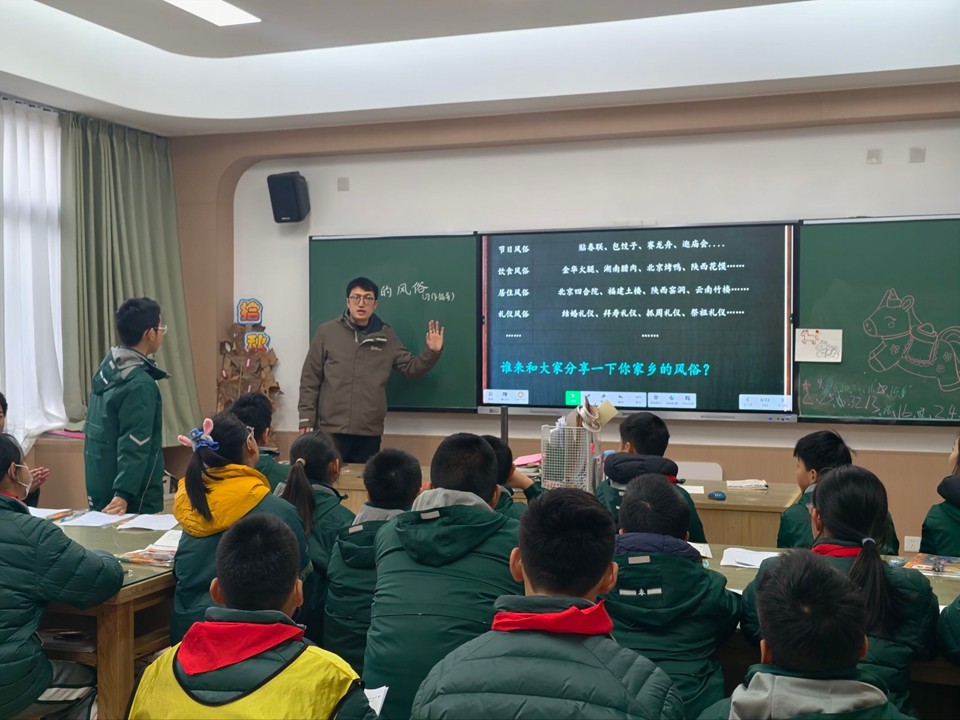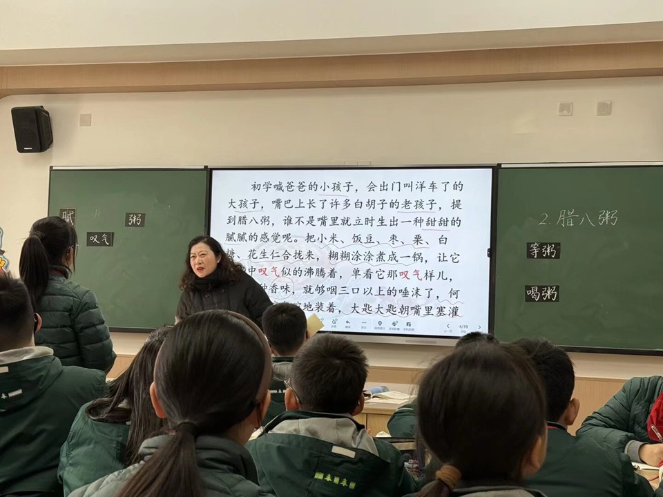 许玲玉老师执教《北京的春节》。课堂上,许老师以时间为轴,带领学生梳理出“腊月初旬至正月十九”的文章脉络,清晰呈现春节从筹备到落幕的完整进程。教学中,许老师重点引导学生分清主次:详析除夕、正月初一、元宵节三大核心场景,聚焦熬腊八粥、守岁、拜年、逛庙会、闹元宵等特色活动;略讲腊月初旬筹备、腊月二十三小年等内容,让学生体会详略得当的表达妙处。整堂课以“脉络梳理+主次辨析+活动聚焦”为主线,帮助学生深度感受老北京春节的热闹氛围与传统文化魅力,高效落实语文核心素养目标。