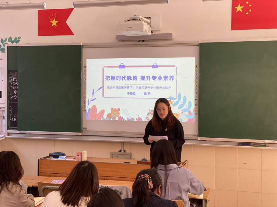 随后,四年级高昕老师开设了题为《把握时代脉搏,提升专业素养》的讲座,她以青年教师的视角,讲述了双减以来自己的学习方法,并以“学习观、思考观和实践观”三个方面来谈双减背景下小学教师提升专业素养的路径。形成良好的学习观,要关注前沿教育讯息,拥有先进的教育视野。为了更加准确高效地获取前沿教育信息,高老师分享了多种“接地气”的新渠道,如学术期刊的公众号、微博等,相较于厚重难懂的专业书籍,新媒体式的检索无疑降低了研究的门槛。通过聚焦教育热词,我们在教育教学研究过程中可以更好地明晰方向,把握时代脉搏。在教师专业成长的过程中,要保持敏锐的观察力,善于捕捉讯息,也要内化成自己的东西,保持大脑的活性。同时也要结合实践,融入到日常的教育教学中。