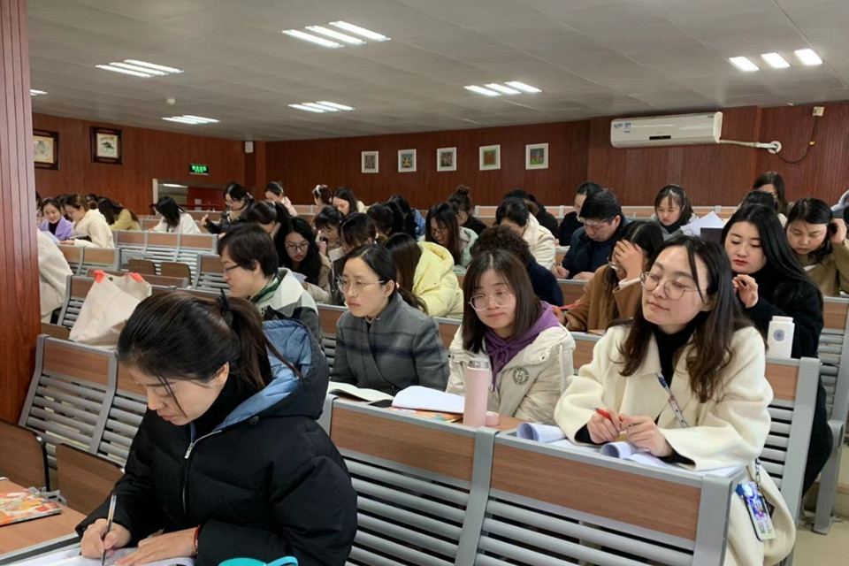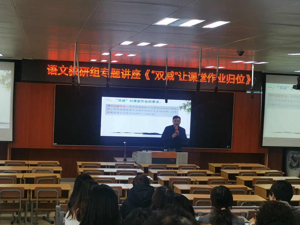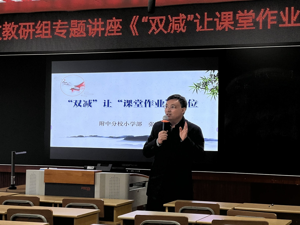 11月25日下午,小学部语文组教研活动如期举行。张建忠主任在小学部多功能厅开展了“双减”背景下,教师如何有效把握课堂,让学生高效学习的有关讲座。全体小学语文老师参加此次活动。