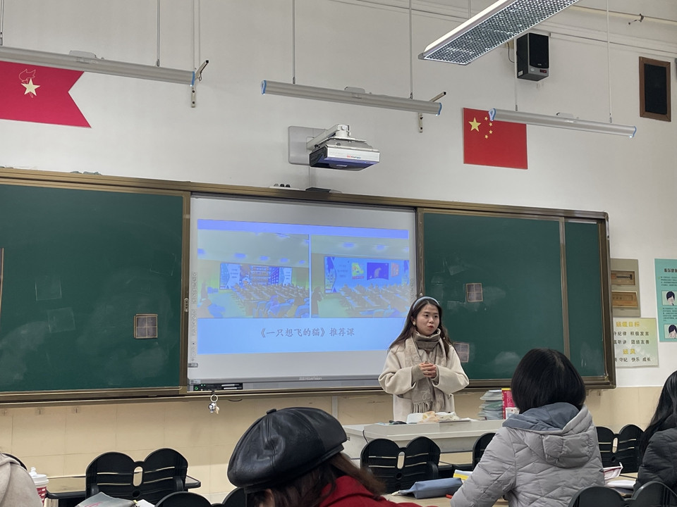 宋老师分享的是上元小学举办的“双减背景下小学语文阅读教学提质增效的实践探索”的主题活动。宋老师分享了自己对几节课例的感想:执教《狐假虎威》一课的老师注重对学生朗读和表演的指导;执教《我要的是葫芦》的老师对学生的阅读指导非常细致;《书戴嵩画牛》一课中,教师善于选取背景音乐辅助教学,提升了教学效果。宋老师重点介绍了我校庞芳老师执教的《忆读书》一课,庞老师的课很好地践行了我校“少教多学”的教学理念,教学思路清晰,非常高效地进行了阅读教学,板书的设计也非常精美,整节课获得了听课老师们的一致好评。