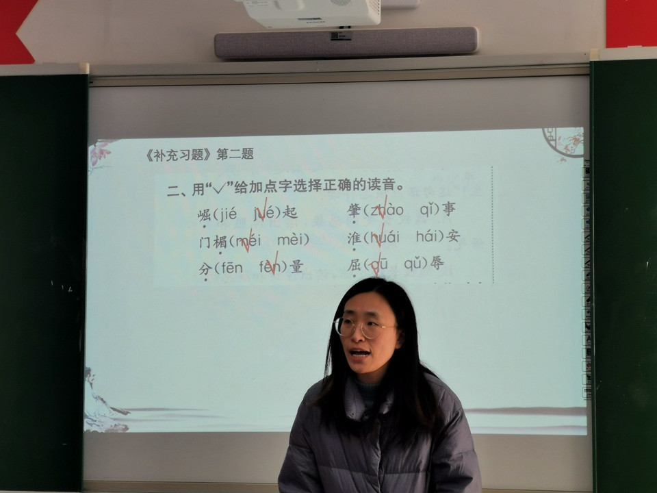 接着,刘静老师传达了区教研员周爱华老师和吴勇老师对两节课的点评,两位老师指出:课堂教学要关注教师本身的语文素养、教师基本功;要关注字词教学,字词教学突破有方法;要重视多种形式的读和入情入境的朗读;要有语用意识,架起文本语言和儿童语言的桥梁;关注落实“双减政策”。这为老师们后面的语文教学掌舵引航、指明方向。