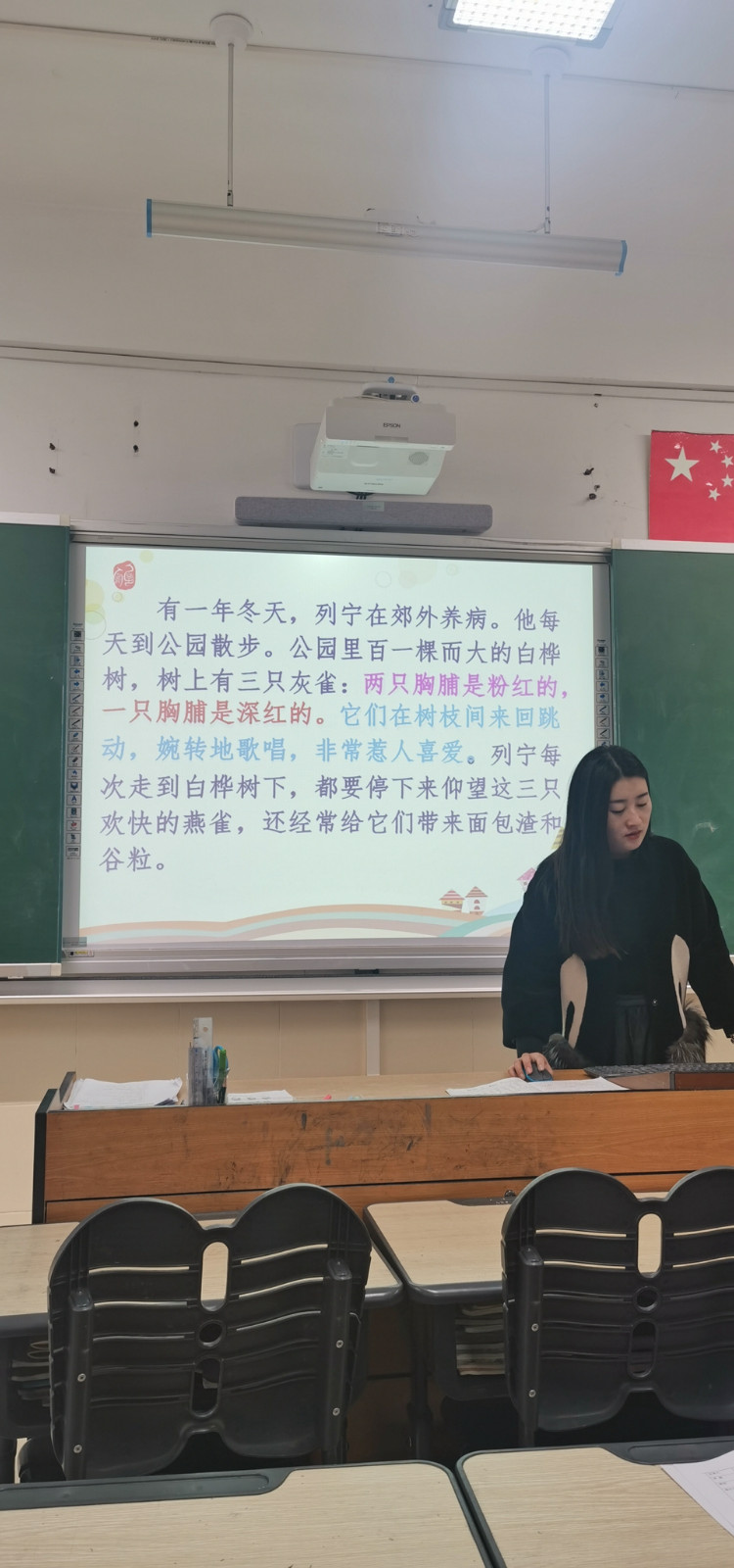 方洁老师进行了第二十五课《灰雀》的主备分享,方老师为大家进行了课文梳理,为大家展示了她的课堂设计与课件,将课文中的重难点非常细致地梳理了一遍。同样地,方老师抓住了课文中有较多对话的特点,抓住对话,精巧地设计了课件,将人物对话分类对比,帮助学生体会对话包含的情绪、情感和言外之意,感受人物内心的变化。