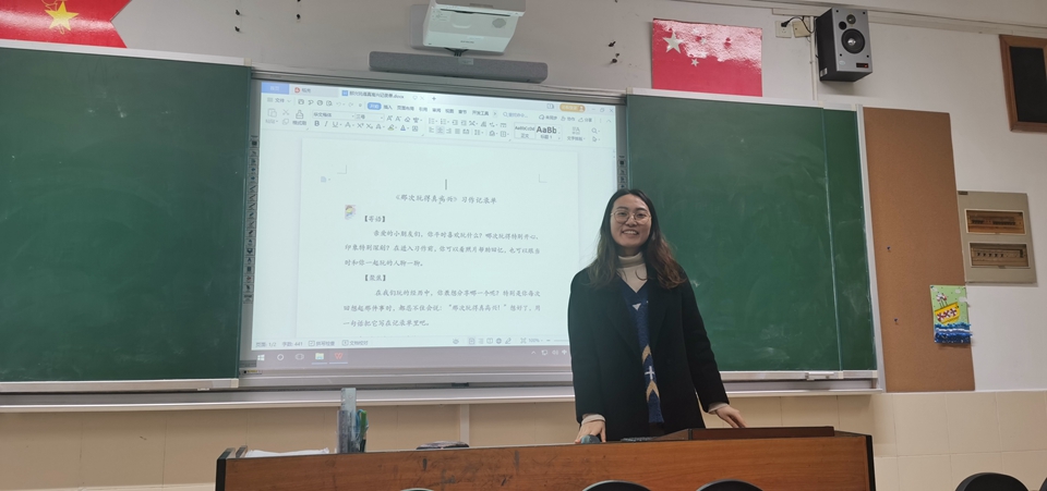蒋珊珊老师为大家带来了《习作八:那次玩得真高兴》的教学设计展示。蒋老师向大家展示了她精心设计的“习作记录单”,为大家梳理了课件,其中包含了“电影镜头思维导图”、“精彩镜头范文展示”、“影评人点评打星”等很多设计亮点,得到了同组老师们的一致好评。