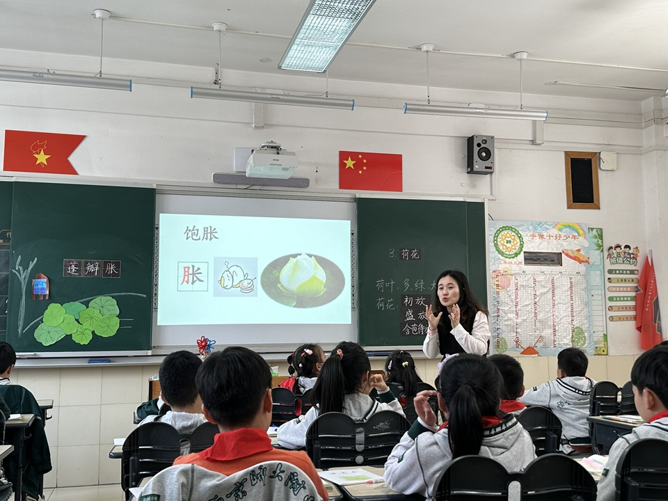 3月份的专家课由三年级陶天慧老师和四年级周丹老师开课。陶老师呈现了三年级《荷花》这一课,课堂上陶老师注重三年级学生的学情,识字教学有创新,如“饱胀”、“挨挨挤挤”、“冒”等词语的理解,不仅让学生理解了含义,还带入到文本里,对所描述的画面有了更深的体会。她的课堂充分体现了学生的主体地位,引导学生主动探索,是师生共同呈现的精彩。周丹老师的《飞向蓝天的恐龙》这课结合了《新课程标准》(2022年版)对中段语文“能初步感受作品中生动形象的语言,能复述文章的大意,积累课文中的精彩句段”这一要求。结合教材的课后题,将本篇课文第二课时教学目标定为:重点学习第4自然段,抓住表示时间的词及描写恐龙特点的关键词句,理清恐龙飞向蓝天的演化过程,能有条理地讲解这一过程,继续体会第四段文章语言表达特点,学会用对比列举的方式介绍事物。
