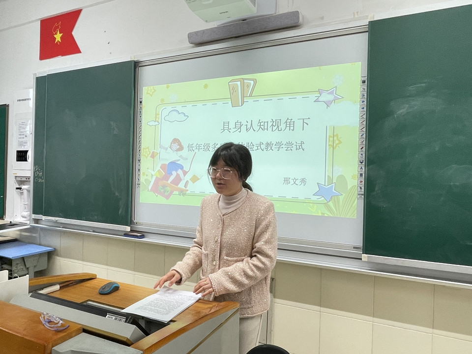 就“具身认知视角下——低年级多感官体验式教学尝试”这个主题,邢老师结合自己的教学实践展开了细致地解读。首先邢老师阐述了“具身认知”是什么,再以课例说明“多感官体验式教学”在课堂上的落实。她以自己执教的《端午粽》为例,向老师们详细地介绍自己是怎么在语文课上调动学生的多感官参与,让学生动起来,让课堂活起来,让知识渗进来。通过看一看,闻一闻,摸一摸,尝一尝的方式,穿插实物展示,调动学生的不同感官,刺激脑神经,用直观形象的感官体验促进思维的发展。邢老师尤其强调了“多感官体验式教学”重视学生自主参与,积极互动,主动表达。