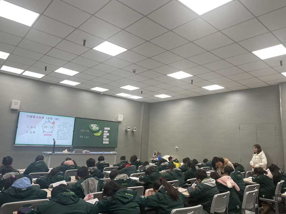 课堂上,科学老师沈老师先向同学们介绍了本次课堂的主人公——毛毛虫。通过多种方式让学生了解到毛毛虫的形态、蠕动方式、生活习性以及化蛹成蝶的整个经过。随后在同学们了解“毛毛虫”后,就由语文老师唐老师带领同学们一起编写属于自己的“毛毛虫奇遇记”。唐老师先对沈老师的科学课堂进行了总结,接着回顾之前学过的几篇科学童话,从中提炼出,要想写好一篇科学童话,必须要有神奇的想象和有趣的情节。在教学环节的设计上,唐老师也是精心安排,充满智慧,学生的创作积极性非常高。现场点评习作环节,唐老师从有没有科学知识、神奇的想象和生动的语言等方面注意进行点评,让课堂十分丰富。