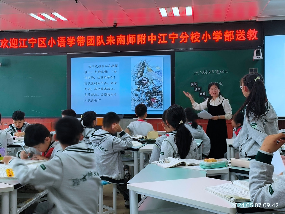 2024年5月7日上午,江宁区几位小学语文学科带头人来南师附中江宁分校小学部开展了一场别开生面的送教活动。此次活动旨在促进校际间的教学资源共享与经验交流,提升语文教学质量。活动地点设在附中分校小学部的B6楼三楼多功能教室,吸引了众多老师参与,小学部高语组教研组长张媛媛老师主持整场活动。