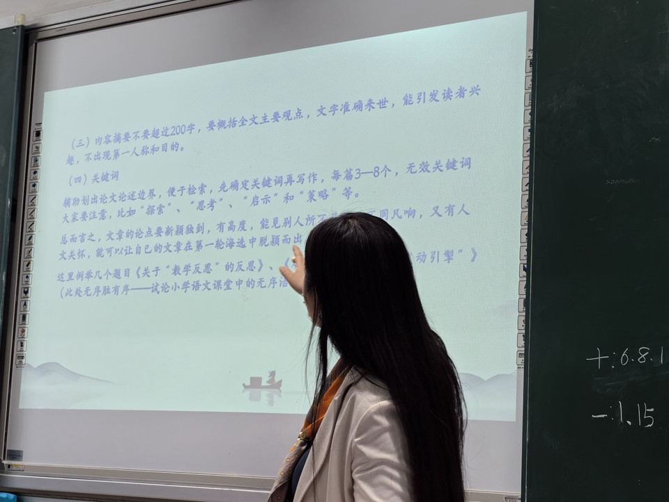这次活动的第一个环节是由刘月霞老师开设主题为《用心记录生活,书写育人智慧》的讲座。刘老师的讲述的内容很接地气,她结合自己这些年的成长经历,以一个普通一线教师的视角来谈写作,谈方法,谈收获。她首先分享了写随笔的好处,鼓励老师们平时多写随笔,坚持写随笔,不断积累属于自己的宝贵“资源”。刘老师说,随笔是进入写作殿堂很轻松的方式,这些随兴而写的文字不但可以让自己记录教育生涯中的难忘和感动、实践和反思,而且这些文章可以随时成为论文和案例的素材,任何时候都让自己“手有余粮心不慌”。接着,刘老师分享了如何借助自己的公开课写论文案例的方法,提醒大家一定要关注“时效性”,紧随当前的教研“热点”来写,提高成功率。最后,刘老师分享了论文写作从题目选择到内容修改的具体方法,以及投稿的方式和渠道,无论是题目的设定,还是关键词的选取,都有细致的讲解。这场微型讲座虽然时间不长,但干货满满,让老师们听了之后有触动、有启发、有收获。