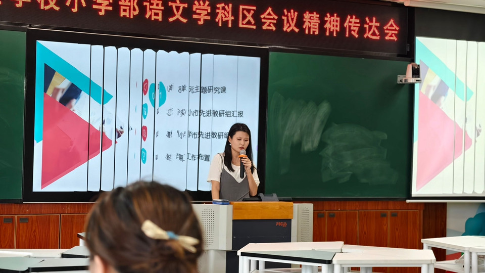 9月12日下午,本学期的第二个教研活动在多功能厅如期举行。本次教研活动旨在传达语文学科区会议精神,强调通过单元整体体现思维教学的重要性,活动由张建忠校长主持,魏澄老师主讲,秉着对语文教学的热爱,小学部全体语文老师参加了本次活动。