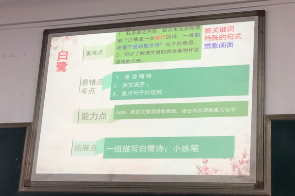 庄俊老师作为备课组长,先布置了学校的学期工作,然后对新学期提出了要求,唐朝辉老师主备《白鹭》和《落花生》两课。首先,唐老师抓住开头的“白鹭是一首精巧的诗”和结尾的“白鹭实在是一首诗,一首韵在骨子里的散文诗”引导学生初步感知白鹭在作者眼中的与众不同,初步体会作者对白鹭的特殊情感。接着,在教学白鹭外形之美时,唐老师先结合第4自然段的一个转折句,通过填空的形式,让学生联系2、3两个自然段的内容,初步了解白鹭的“精巧”之美。而教学第5自然段时,则是通过看图、理解词句等再次感受白鹭无论是色素的搭配,还是身段的大小都很适宜,进一步体会到白鹭的“精巧”之美。最后,在感情朗读中,体会作者对白鹭的喜爱之情。在教学白鹭活动的三个场景时,唐老师先让学生借助句式概括各段大意,接着具体学习了第6自然段,通过交流画面内容和给画面取名的方式,让学生感受到白鹭的和谐之美,从而感知这种美是韵在骨子里的,进一步体会作者喜欢白鹭的原因。《落花生》这一课,难点在于理解课文中含义深刻的句子,学习花生朴实无华,默默奉献的精神,懂得“人要做有用的人,不要做只讲体面,而对别人没有好处的人”的道理。唐老师建议引导学生谈论花生的好处,借物喻人,从而教育学生做人要做对社会有用的人。