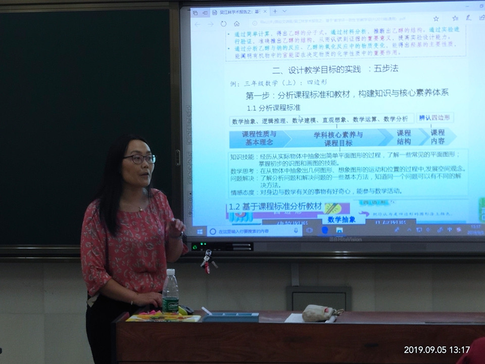 在简要回顾了一下上一学年的工作之后,张老师先给大家出了一套关于别开生面的“教学设计”选择题,参会老师们交流热烈。接着张老师给大家介绍了浙江名师吴江林老师《基于教学评一致性的教学活动设计》,让大家对如何确定教学目标、设计科学的教学评价和设计有效的教学活动又有了新的认识。接着,张老师又对课程标准进行了解读。其中“主动识字、独立识字”的理念引发了大家的深入思考。新教师姚丹在会上发言“作为一名新教师,我在书写教学设计的时候,往往很刻板地参考教师用书。今天的会议给了我很大的启发,原来教学目标有着这样重要的指导作用,以后要更加关注学情,从学情出发设计教学目标。”