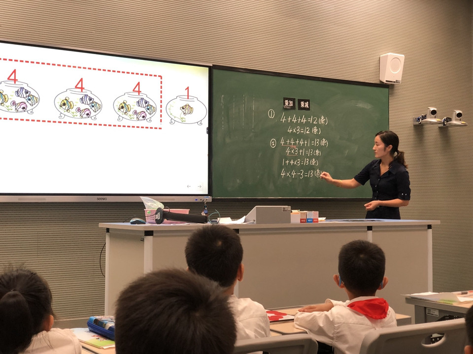 这节课由小学二年级数学老师赵越进行了教学展示,课题为《乘加乘减》。这节课是在学生初步认识了乘法的意义和学习了 1-5 的乘法口诀的基础上,引导学生体会由于观察、 思考的角度不同,解决问题的方法也是不一样的。让学生在经历自主探索、合作交流的过程中感受解决问题的不同方法,体验策略的多样化。本节课赵越老师以学生为主体,少教多学,运用自主探究教学模式进行教学。