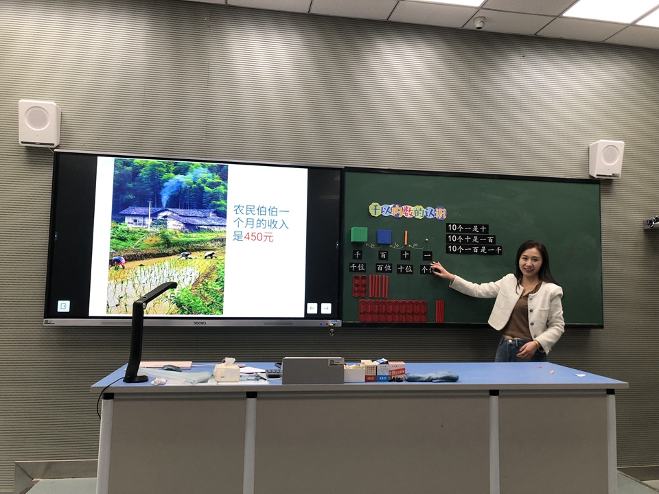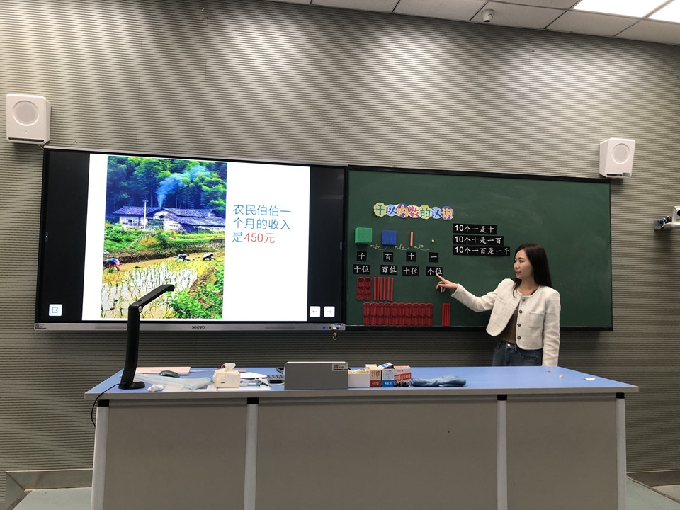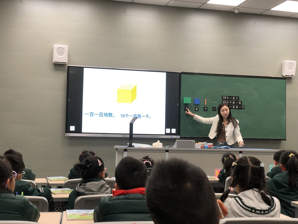 2024年3月11日,小学部李菁老师执教苏教版二年级下册第四单元的第一课时《千以内数的认识》李老师基于单元整体教学,考虑到在本单元之前,学生接触到的都是比较小的数,这就限制了他们的认识,而在本单元起,学生将学习新的计数知识,用较大的数描述、交流事件与现象,他们的数感会有明显的发展。因此,学生在第一课时《千以内数的认识》中对于数的读、写、数的组成的自主建构就显得尤为重要。基于此,李老师精心设计:先开门见山,直接出示100个小方块让学生估一估,再通过数数验证的过程带领学生回顾一年级下学期所学的100以内数的方法以及相应的计数单位等。调动学生已有的知识经验,为新知的探究打下基础,引导学生积累对数的感觉,体会估数的方法,为进一步培养学生数感、后续认识和建立“1000以内数”的概念提供感性经验。为了巩固学生对计数单位及本节课重难点“十进制关系”的认识和理解,李老师带领学生将视野投入更广阔的空间:三字经中的数学文化和日常生活中的人民币,学生的认识得到升华。对于难点突破,李老师为不同层次的学生提供不同的素材:方块模型、小棒和计数器,在操作与思考中探究更大的数的组成。由具体到抽象到数学建模,学生的思维得到了发展。