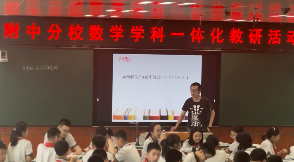 第一节鲍庆贺老师的《解决问题的策略》在课上注重去引导学生学会如何探索规律,通过猜想、列举、观察、比较、推理、操作这些活动充分让学生去体验探究方法、感悟数学思想,积累活动经验,正所谓“授人以鱼不如授人以渔”。第二节初中部郭炜的《含参的一元一次不等式》展示了初中部对于复习课的探索与追求。通过题组的不断变化,在深化方法的基础上,发展了学生的分类讨论思想及逻辑推理能力,让孩子的理解走向深刻。