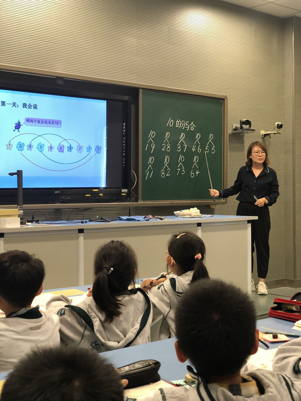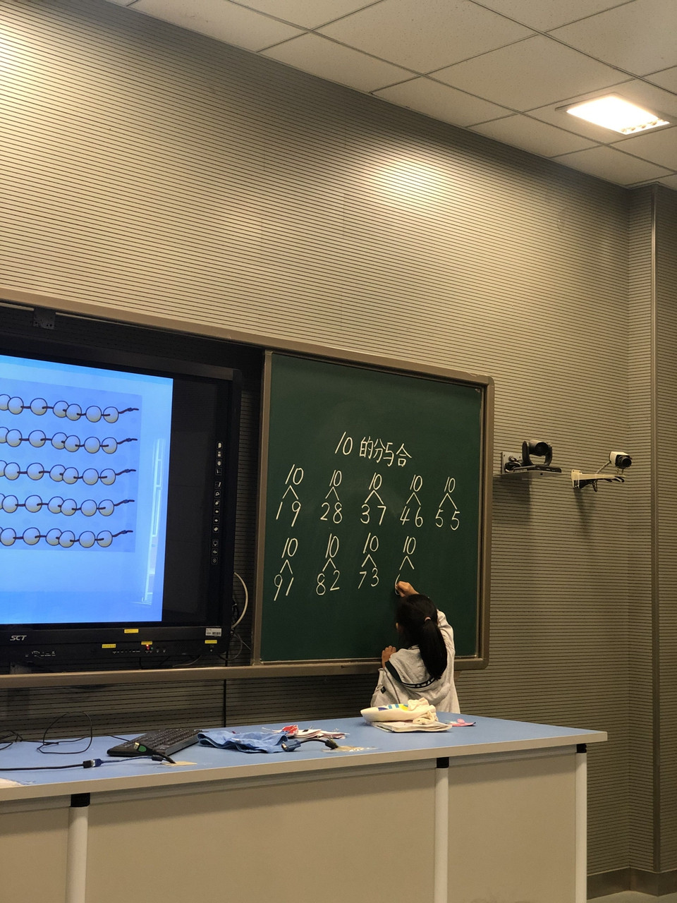 第二节罗老师执教一年级《10的分与合》。罗老师从游戏引入,激发学生兴趣!从图上分珠子到分解数,再到通过推想有序记忆,都是让学生独立完成的,充分给学生提供自主探索的机会,让学生充分利用已有的学习经验,主动进行操作,理解并掌握10的分与合。