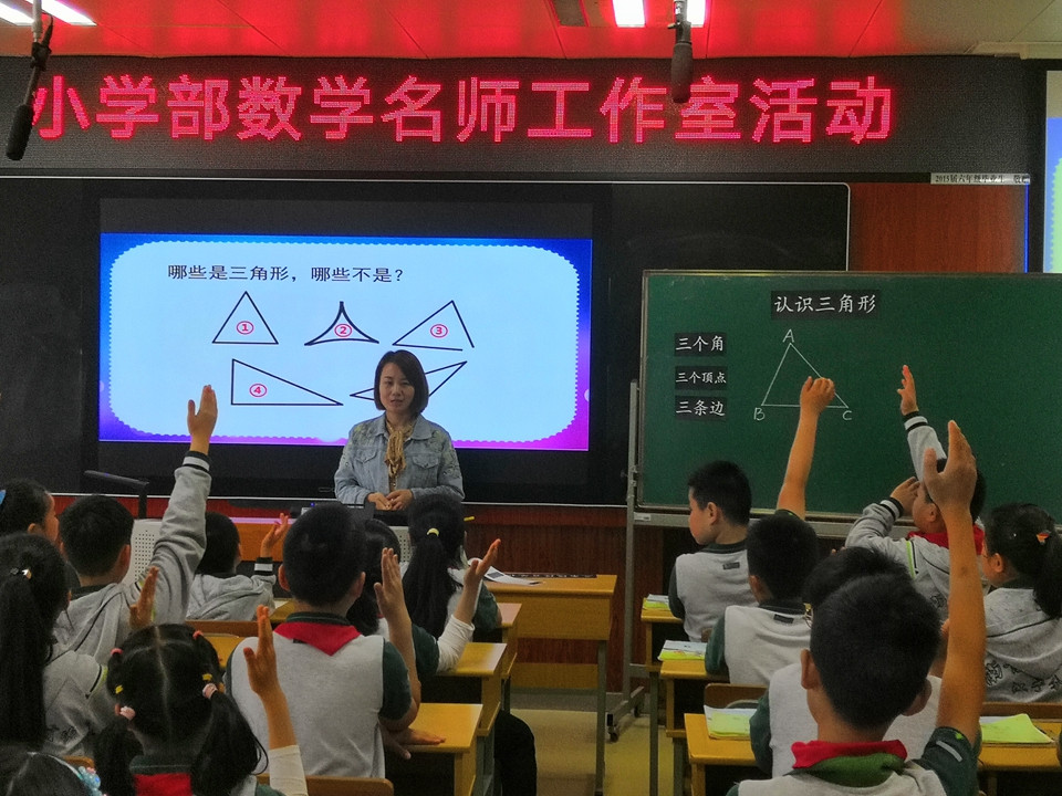 郁美华老师执教《三角形的认识》。整节课注重操作活动,让学生在直观形象的操作活动中感受概念,再通过对比辨析,深入理解概念。郁老师在教学三角形的高的环节中,注重让学生动手操作,一个同学在投影前演示,其他同学提炼方法和注意事项,真正做到了以学为中心,受到了戴主任的好评。