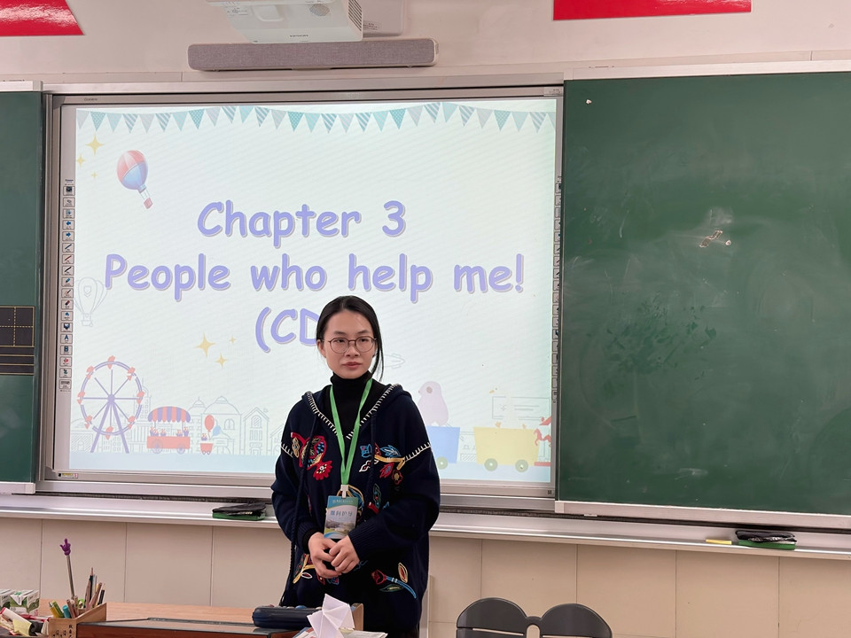 蔡月老师首先带组内老师回顾近期教学内容,明确教学进度。然后主备教师,罗丹老师以“身边的帮助者”为核心,结合Chapter 3的教学重点——“掌握学科、职业类的词汇(如PE, Maths, Chinese, English,caretaker,prefect等)”“运用句型-Who’s your ... teacher? -My ... teacher is Mr/ Miss/ Mrs ... She/He is ... I like her/him.等句型描述校园里帮助我们的人,呈现了“情境导入-词汇建构-语言运用-情感升华”的四阶教学设计。设计亮点在于将语言学习与生活体验深度融合:通过播放“校园保安帮助同学”的真实短视频激活学生兴趣,再以“角色扮演小剧场”让学生模拟“求助-帮助”场景,最后通过“绘制我的感谢卡”任务,引导学生用简单英语表达对身边帮助者的感谢,实现“学语言、懂感恩”的双重目标。