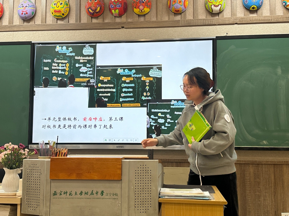 讲座聚焦“思维・共生:构建深度学习新生态”的主题,荀老师先剖析当前课堂存在的“多活动缺深度”“多灌输少参与”等问题,指出其与新课标“深度学习、素养导向”要求的差距。随后,她详解“思维・共生”教学范式的核心逻辑,从个体层面的“思维品质与语言能力同步发展”,到群体层面的“生生互动培养合作能力”“师生互动落实教-学-评一体化”,阐明该范式如何对接新课标四大素养。荀老师还结合 Unit 6 Weather的“大问题导向课例”、Wrap-up的“活动支撑课例”及“交流互动闭环课例”,具体展示“思维・共生”在教学中的应用路径,让教师明确如何将素养目标融入日常教学。刘嘉懿老师结合2025年省赛课的Unit 6 Weather,向大家分析了其如何在单元整体框架下创设读写共生课堂,如导入环节的设置,解构文本的所依托的问题链和模块图等,以及三个课时板书的整体性。让教师明确基于译林新教材小学单元整体教学读思共生课堂如何培养学生思维能力,提升核心素养。