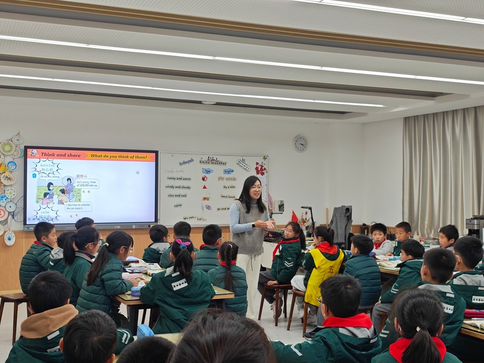 第一课时由2025年11月18日陈荣华老师在三楼多功能厅开设,本课时以歌曲导入,迅速激活学生已有经验并营造轻松的课堂氛围。随后借助 AI 视频天气预报创设真实情境,带领学生整体感知天气相关表达,在“看一看、说一说、学一学”中自然进入单元主题。课堂在核心问题 “What do you do in different weather?” 的引领下层层推进,陈老师将 Cartoon time 与第一课时词汇、句型有机整合,通过任务驱动、情境对话与角色扮演等方式促进学生理解与运用,课堂衔接自然、流程顺畅。教学过程中,陈老师语言示范清晰、追问精准,引导学生从描述天气走向表达生活选择,并在逐步深入的交流中渗透“关注天气、合理安排活动、健康生活”等情感价值。最后,陈老师以一首趣味歌曲收尾,巩固所学内容,再次提升学生参与度,课堂在愉快的氛围中圆满结束,也为为整个单元的学习奠定了轻松愉快的基础。