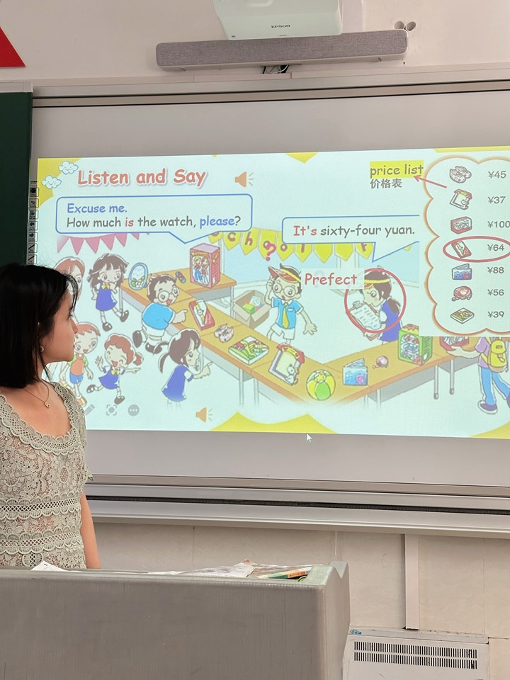 首先由主备人王劲草老师在投影仪上展示并讲解课件,对单元目标进行解读,再根据单元不同板块进行分析,确定不同教学目标。A板块第一课时,旨在让学生了解故事大意,听懂理解并会读目标句型,How much is/are....It’s/They’re... yuan.在第二课时,教授B板块时,可以对A部分的生词进行新授和操练。C、D板块可以分成2-3课时进行教授。最后E板块一课时,F和语音板块一课时,一个单元计划7-8课时完成新授。