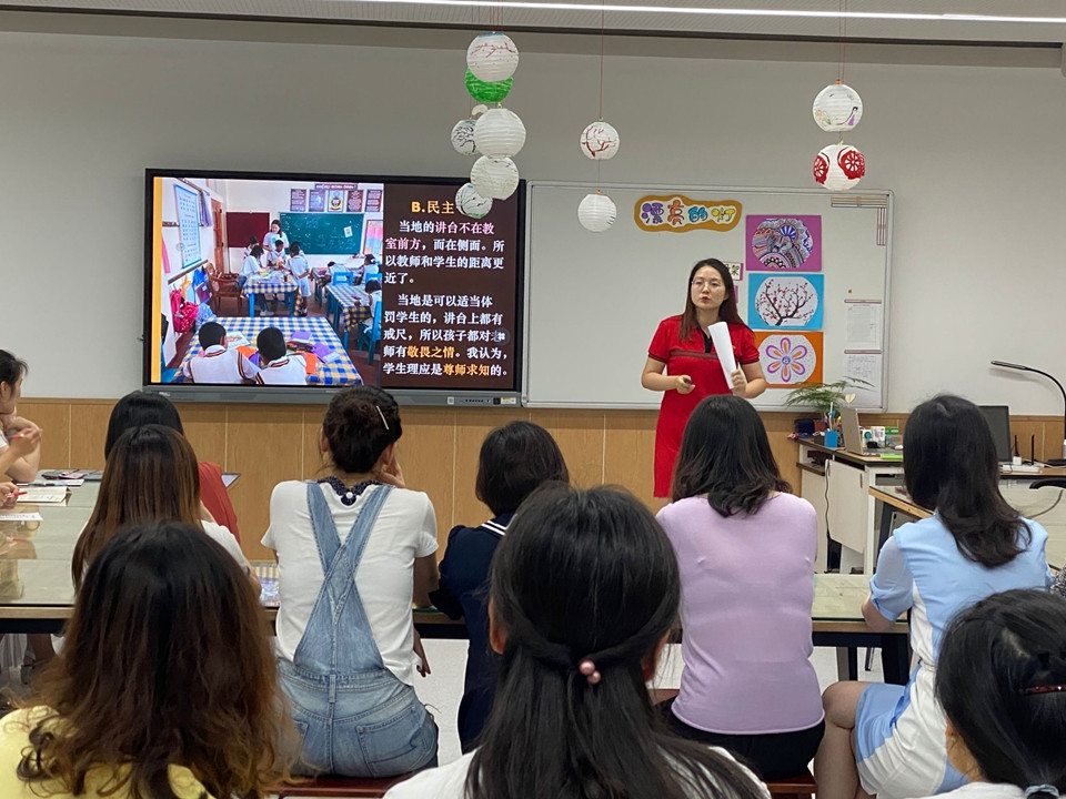 然后她从A.自然和谐。B.民主平等。C.适当改变教学时间的安排,让学生有充分的时间展示学习成果D.多元的评价方式与个性发展。这四个方面结合在斯里兰卡支教的实际情况来阐述“生态课堂”。让我们看到了她在当地沉浸式地教学过程,以及如何展开生态教学的一些例子。期间,她还介绍了自己以前在美国当地小学实习的2个小故事,着眼于培养孩子的创新精神和动手能力,大家受益匪浅。