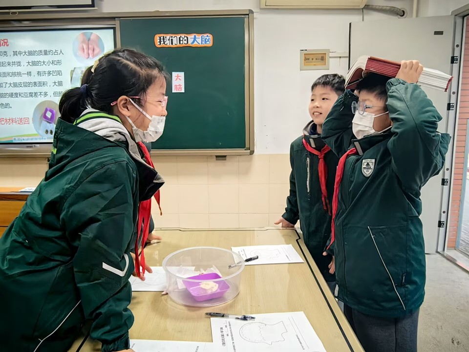 在“活动体验,建构知识”环节,杨老师设计了一系列生动有趣的实践活动,引导学生从外形、重量、触感等方面深入认识大脑。首先,通过科学阅读,让学生对大脑有一个基本认知。然后,通过体验环节帮助学生准确感知大脑的重量、大小、质地、形状。