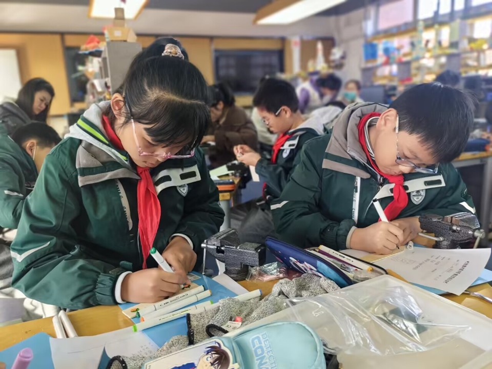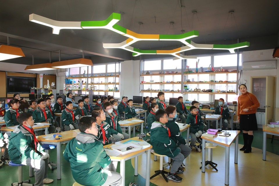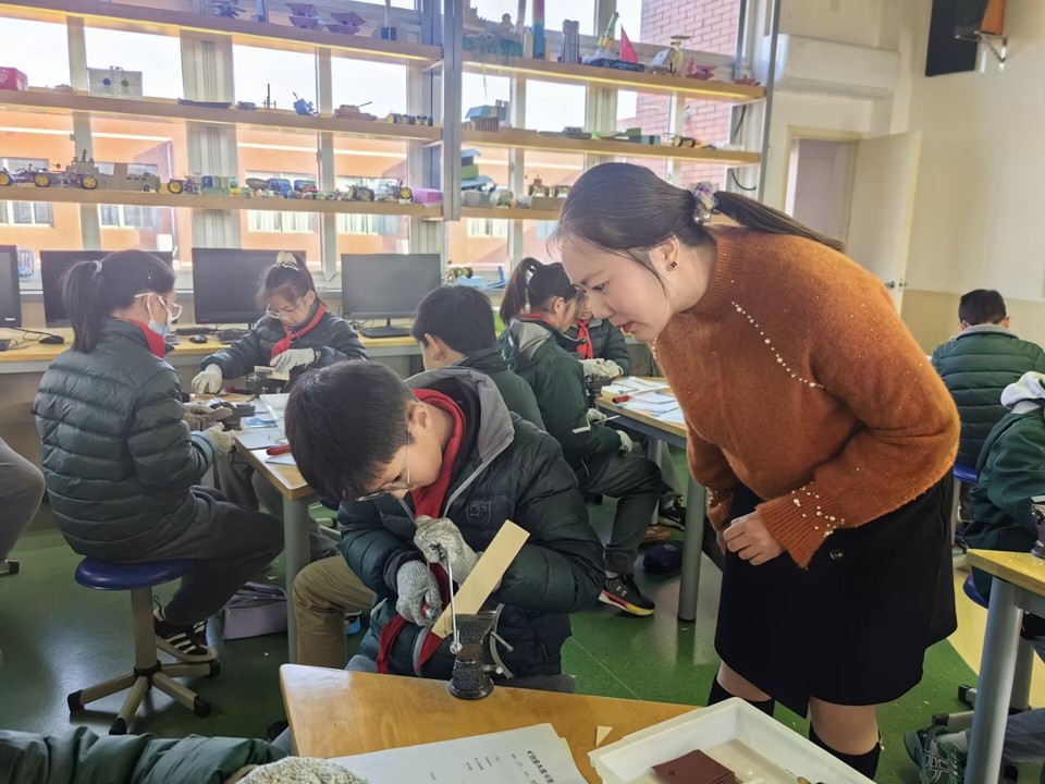 2025 年 11 月 20 日上午,沐浴在冬日的阳光中,沈君君老师在I创教室执教五年级工业生产劳动任务群项目课《创意木书签》,课例以工程思维培养为核心特色,充分契合劳动新课标要求,全体科技组教师共同观摩交流。